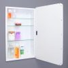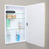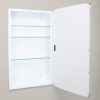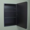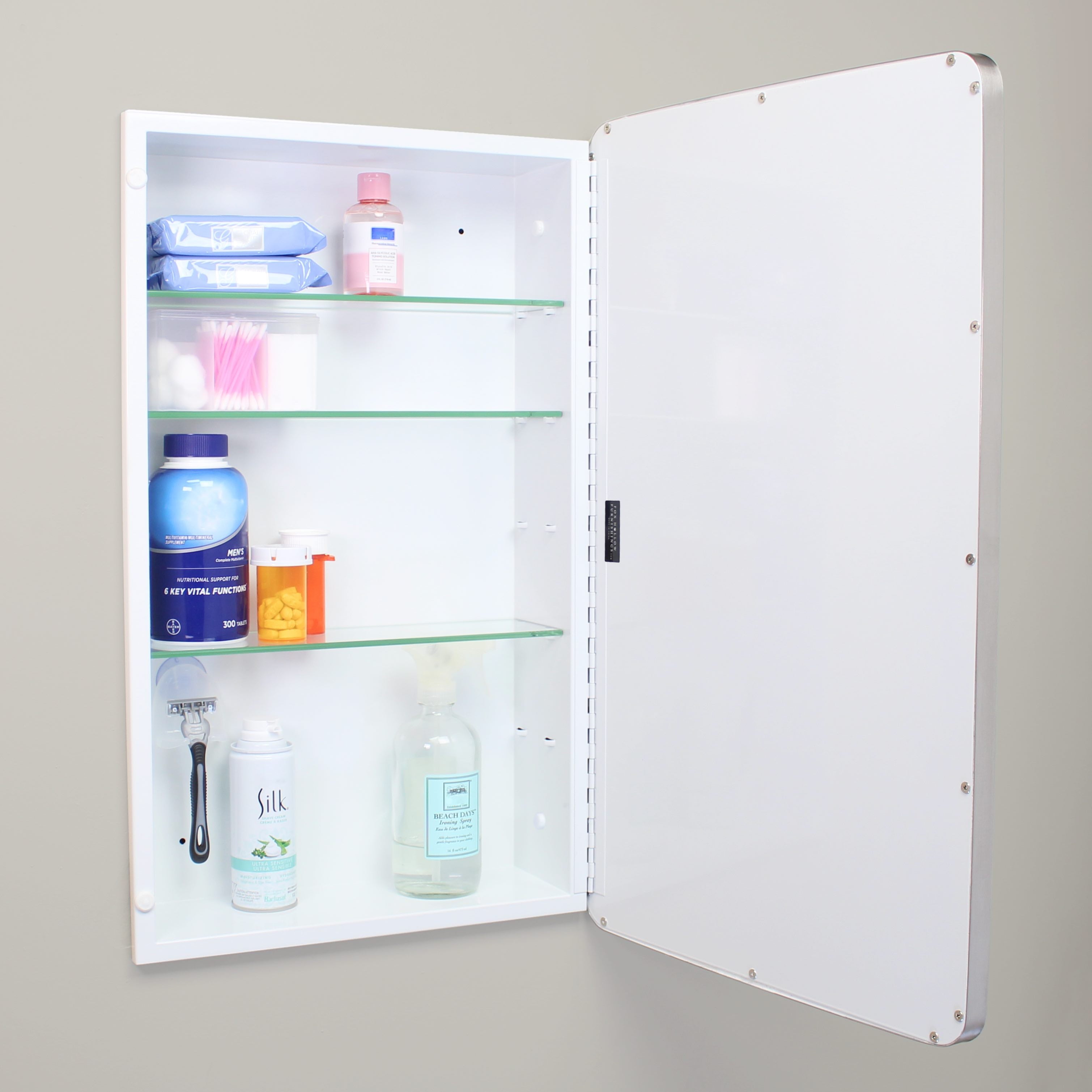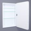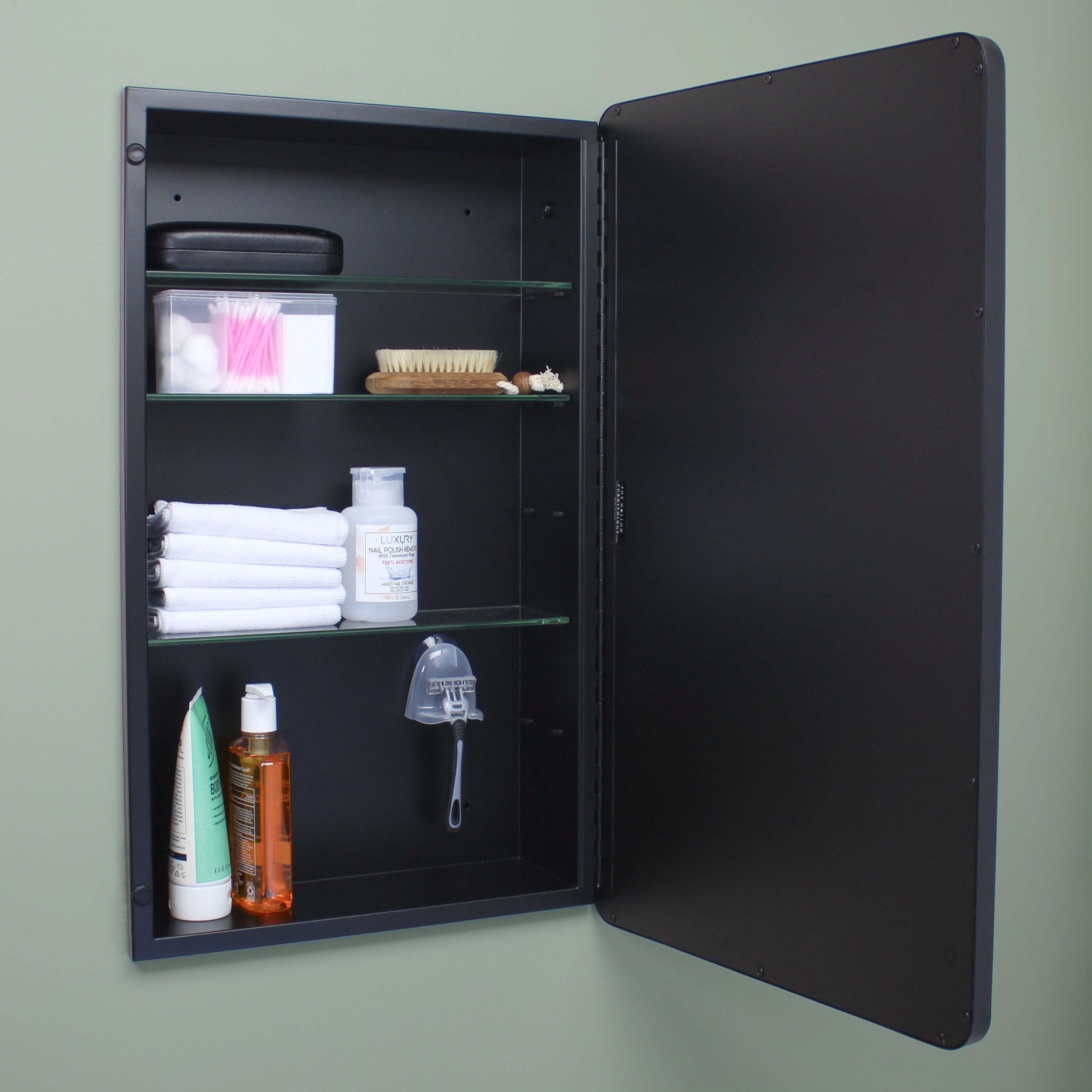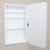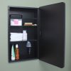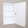 Available in multiple sizes (14×18 with 16×20 door, 14×24 with 16×26 door) and colors (Black, White, Chrome, Brushed Nickel, Gold) to suit your space. The magnetically closed door conceals adjustable, tempered glass shelves.
