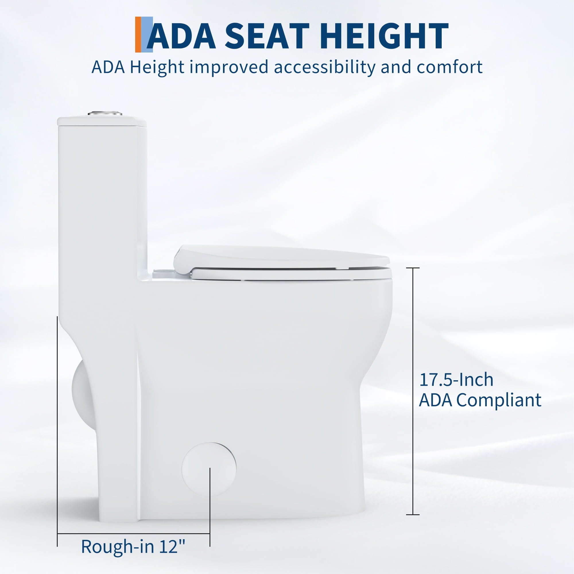 - Chair Height Toilet: ADA Compliant. Features 17.5″ seat height from floor to seat. Comfortable height seating, ideal for the elderly and individuals with disabilities which makes sitting down and standing up easier.