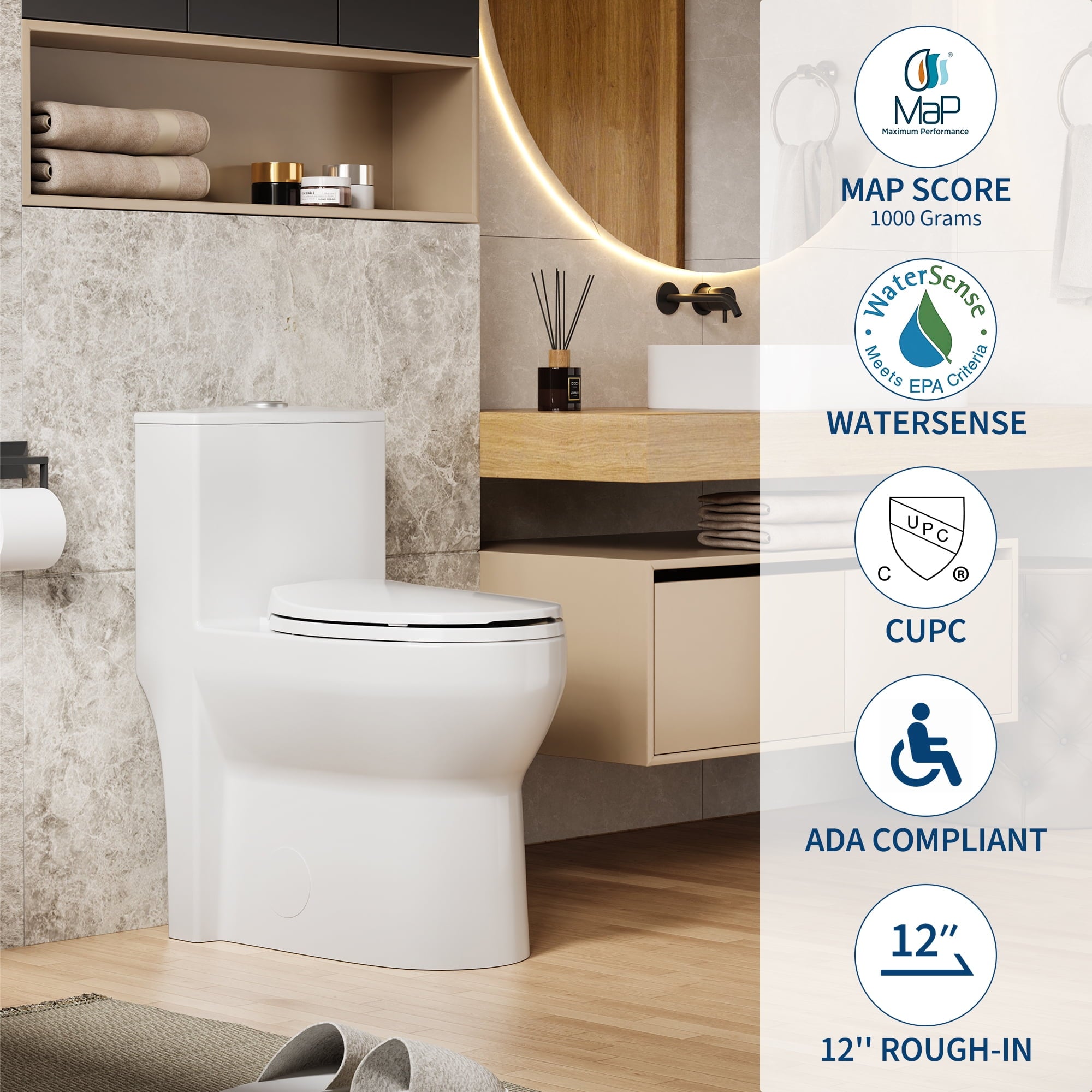 - Map Flush 1000 Grams: Great Maximum Performance Flush score of 1000 grams, meets Water Sense criteria. Such a powerful and water-saving toilet bowl comes from our research and development of innovative toilet plumbing structures.