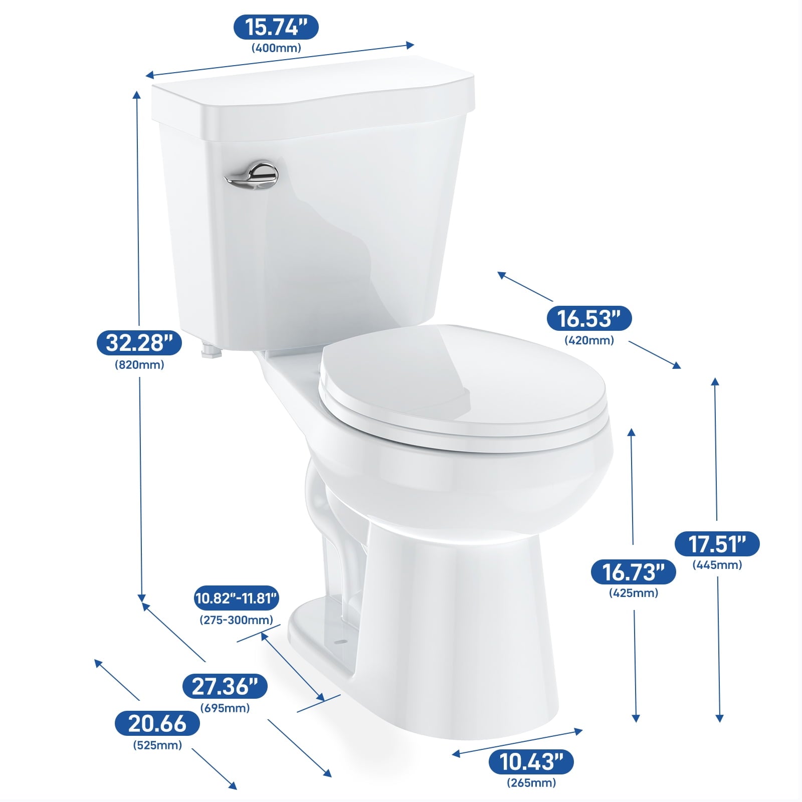 - Universal Height Toilet: The height of the 2-piece toilet from floor to seat is 17 inches. It makes sitting down and standing up easier and more comfortable