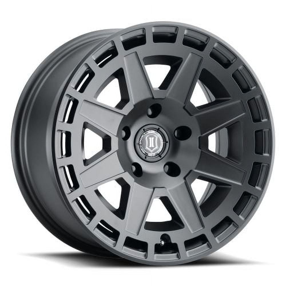 ICON ALLOYS COMPASS SAT BLK – 17 X 8.5 / 6X135 / 6MM / 5″ BS. ICON ALLOYS COMPASS SATIN BLACK – 17 X 8.5 / 6 X 135 BOLT PATTERN / 6MM OFFSET / 5″ BACKSPACE. ICON Alloys is proud to introduce our latest wheel design, the Compass. Featuring a modern 8-spoke design, sharp lines, a vented rock ring, and “ICON-optimized” dimensions, this new wheel is not only designed to improve the looks of your Jeep, truck, or SUV, but the overall function as well. Available in all-new Satin Brass and classic Satin Black finishes, the Compass has a style that is anything but ordinary.. Staying true to the ICON Alloys approach, the 17 Compass has been engineered to maximize caliper clearance and optimize wheel position for un-hindered suspension travel and steering function. Backspace and wheel offset dimensions have been strategically developed to reduce scrub radius, improving all-around handling and ride quality. The ICON Alloys Compass has also been strength tested to yield a 2,750lb load rating – making it one of the strongest wheel options on the market. With build features such as these, it’s clear that a set of ICON Alloys Compass wheels is the perfect complement to an ICON Vehicle Dynamics suspension system.17×8.5 Icon Alloys Compass Satin Black Wheel 6×135 (6mm)