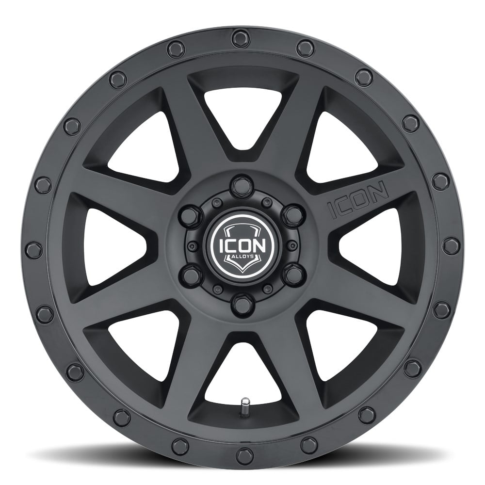 ICON ALLOYS REBOUND SAT BLK – 17 X 8.5 / 6 X 5.5 / 0MM / 4.75″ BS. ICON ALLOYS REBOUND SATIN BLACK – 17 X 8.5 / 6 X 5.5 BOLT PATTERN / 0MM OFFSET / 4.75″ BACKSPACE. Bring a bold new look to your ride with the all-new ICON Alloys REBOUND! Combining sharp lines, a concave spoke design, and “ICON-optimized” dimensions, these wheels will increase both the form and function of your Jeep, truck, or SUV. Staying true to the ICON Alloys approach, the REBOUND has been engineered to maximize caliper clearance and optimize wheel position for un-hindered suspension travel and steering function. Backspace dimensions and wheel offset have been strategically developed to reduce scrub radius, improving all-around handling and ride quality and making a set of these wheels the perfect complement to an ICON Vehicle Dynamics suspension system.Icon Vehicle Dynamics 1817858347SB ICON ALLOYS, REBOUND, 17×8.5, SAT BLACK, 6×5.5