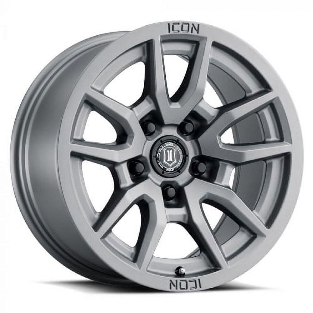 ICON ALLOYS VECTOR 5 TITANIUM -17 x 8.5 / 5 x 150 / 25MM / 5.75″ BS. ICON ALLOYS VECTOR 5 TITANIUM – 18 X 9 / 5 X 150 BOLT PATTERN / 25MM OFFSET / 6″ BACKSPACE. The ICON Alloys Vector 5 wheel incorporates sharp lines and an aggressive spoke design while a featureless lip provides clean looks and makes care & maintenance an easier task (doesn’t trap debris as easily). Combining these bold looks with ICON optimized dimensions, the Vector 6 is designed to improve the form and function of your truck or SUV. Backspace and wheel offset dimensions have been strategically developed to reduce scrub radius, enhancing handling characteristics and ride quality – this is truly a “wheel designed with suspension in mind”.17×8.5 Icon Alloys Vector 5 Titanium Wheel 5×150 (25mm)