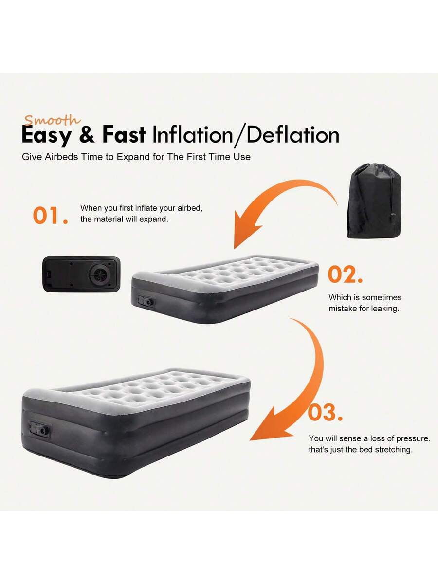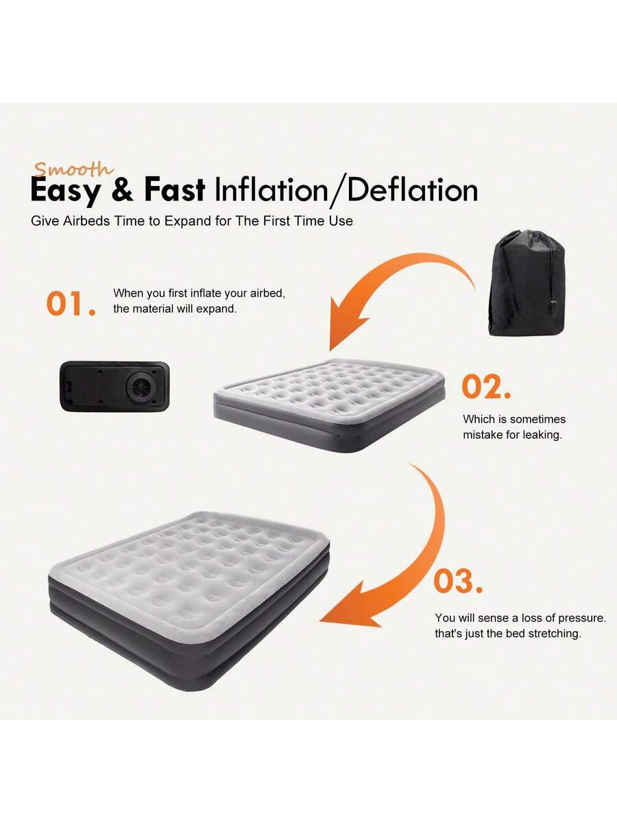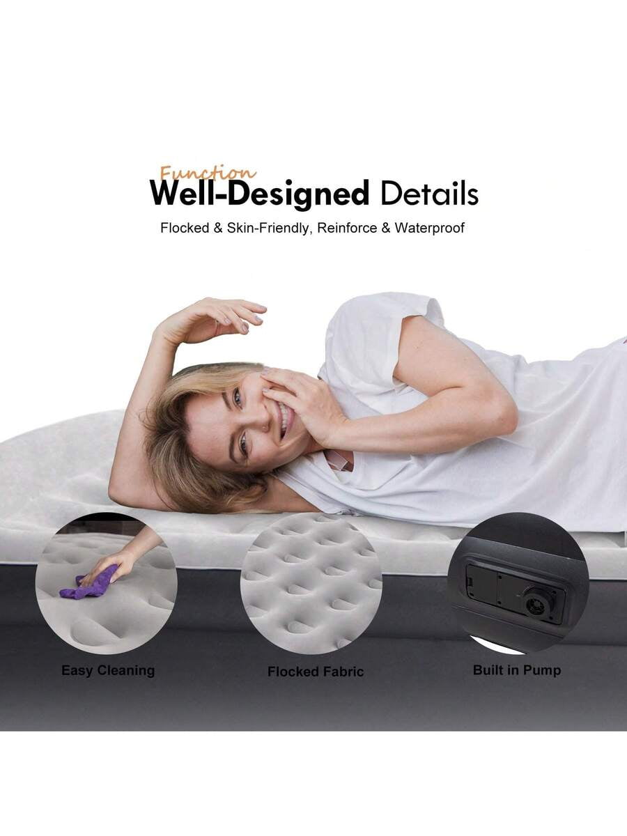 Set Up in Minutes: No More Manual Pumping:Forget struggling with hand pumps or borrowing electric ones—this airbed has a built-in electric pump that does all the work. Just plug it into a standard outlet (or use a car adapter for camping, not included), press the button, and it inflates fully in 2 minutes. Deflating is just as fast—perfect for when you’re in a hurry to pack up camp or clear space for guests. The pump is quiet, too—no loud buzzing to disturb others.