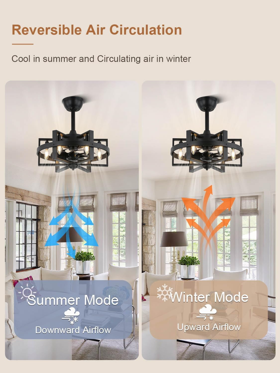 • Safe Cage Design:8 reversible blades discreetly housed within the cage to ensure safety without compromising the strong output of wind power. Forward rotation to create a cool breeze in the summer, reverse rotation to aid in rotating warm air in the winter.
