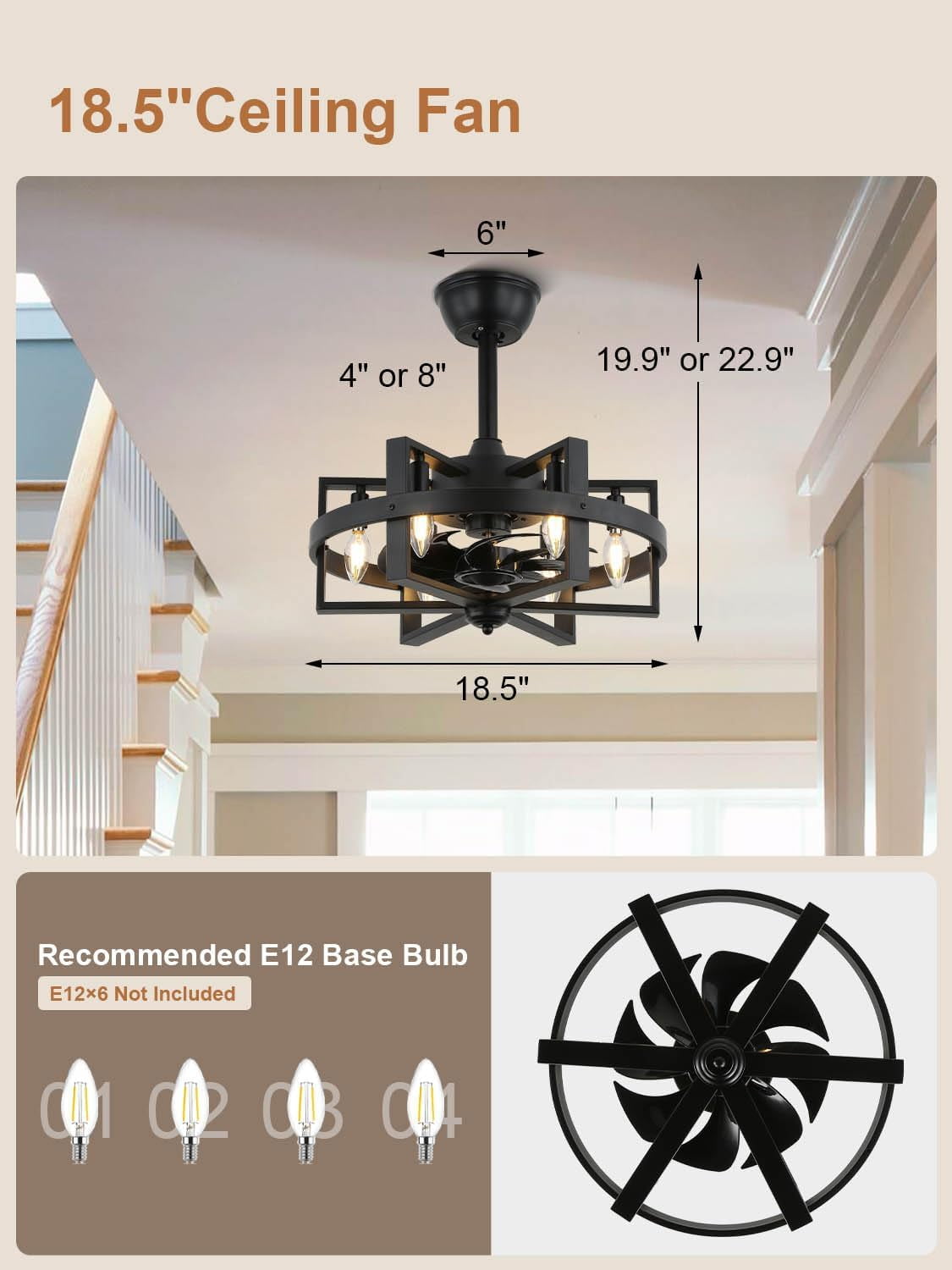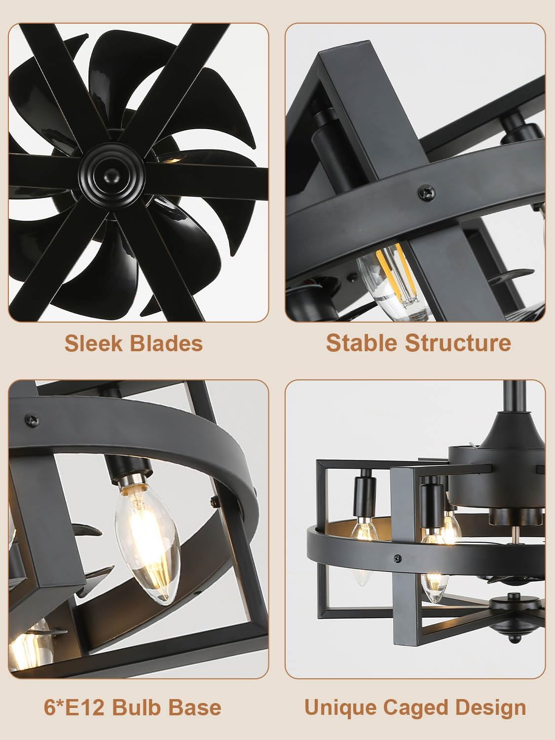 • Modern Ceiling Fan:This 18-inch brush nickle ceiling fan with light features 6*E12 light bases (bulbs not included) and metal caged frame, adding a modern touch to rooms with limited space. It is ideal for kitchen, bedroom, dining room, and living room.