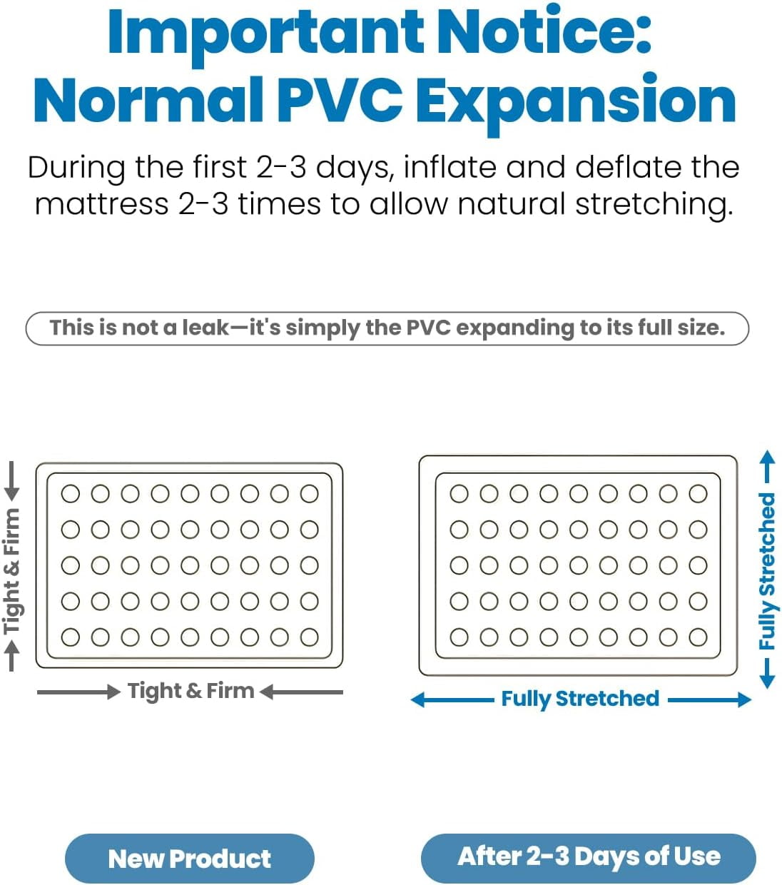 - Normal PVC Expansion After 2-3 Days: During the initial inflation, the self inflating air mattress will stretch slightly. NOT leaks! This is a natural process, and the mattress will fully settle within 2-3 days. Re-inflate as needed to maintain ideal firmness.