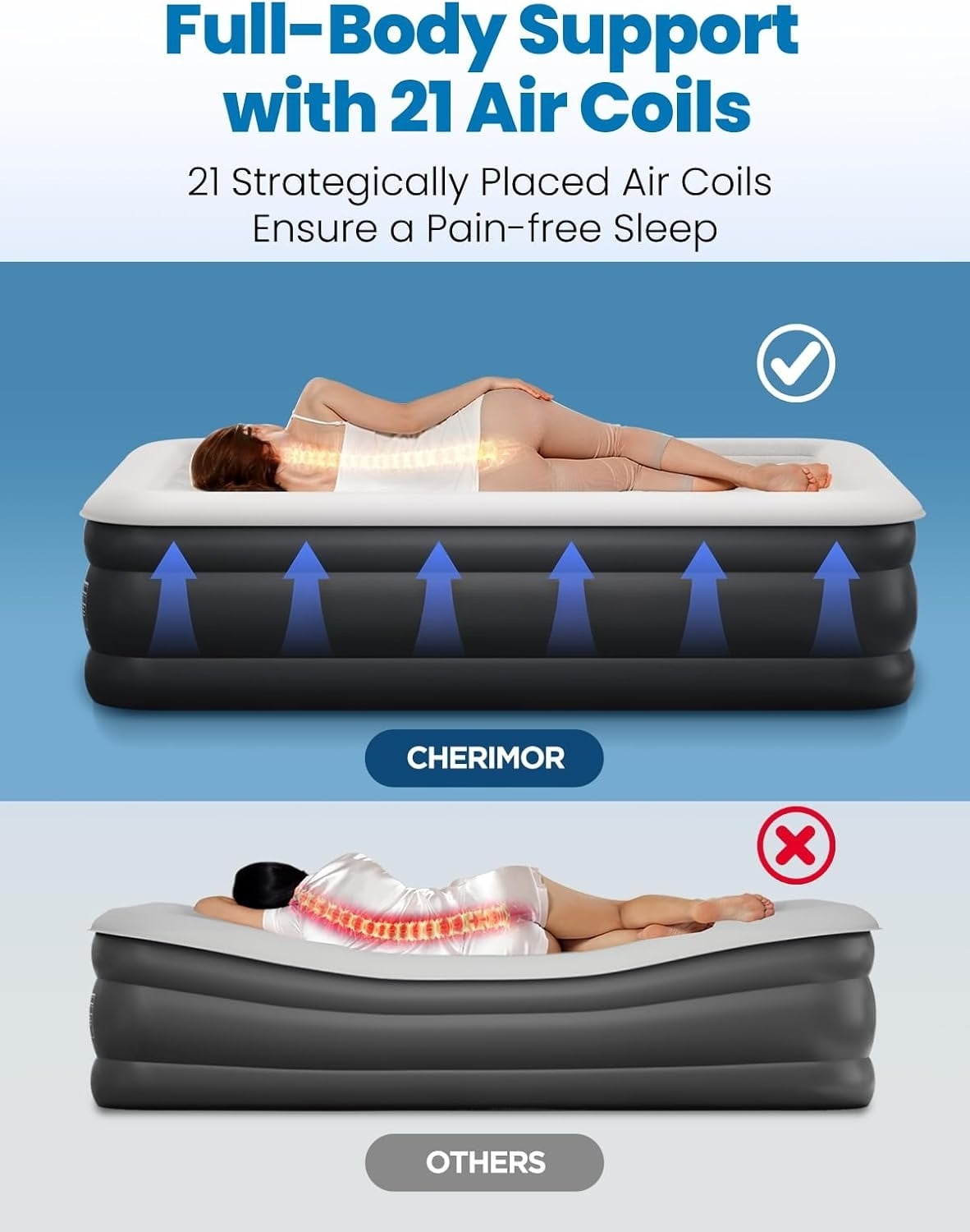 - Honeycomb Pillar Design for Firm Support: Equipped with 21 strategically placed air coils and a honeycomb pillar structure, this air bed evenly distributes body weight, offering full-body support that prevents sagging and ensures a pain-free sleep. The twin air mattress with built in pump raised maintains your body’s natural alignment, providing superior comfort all night long