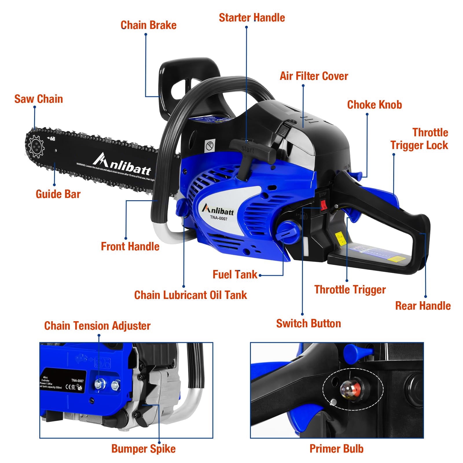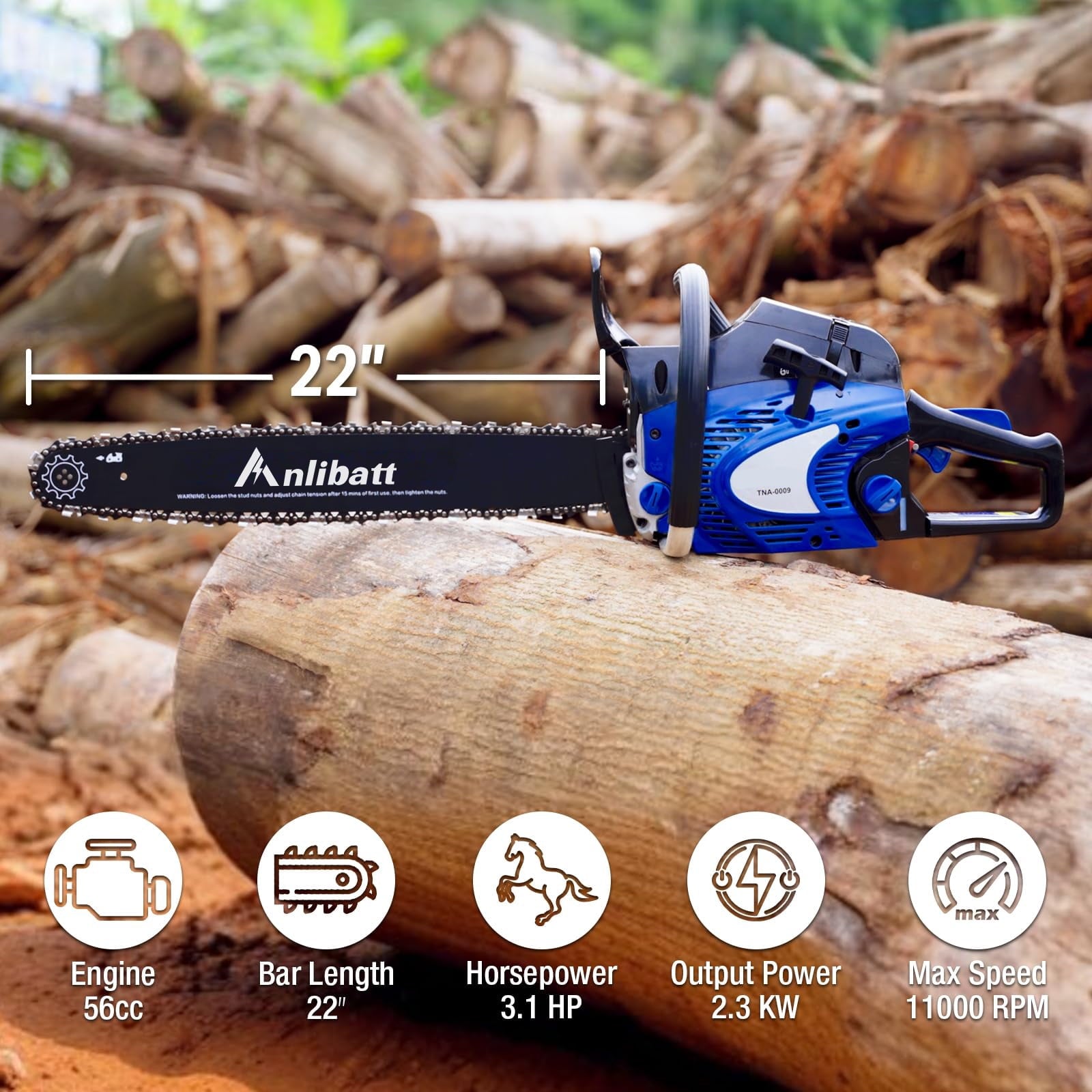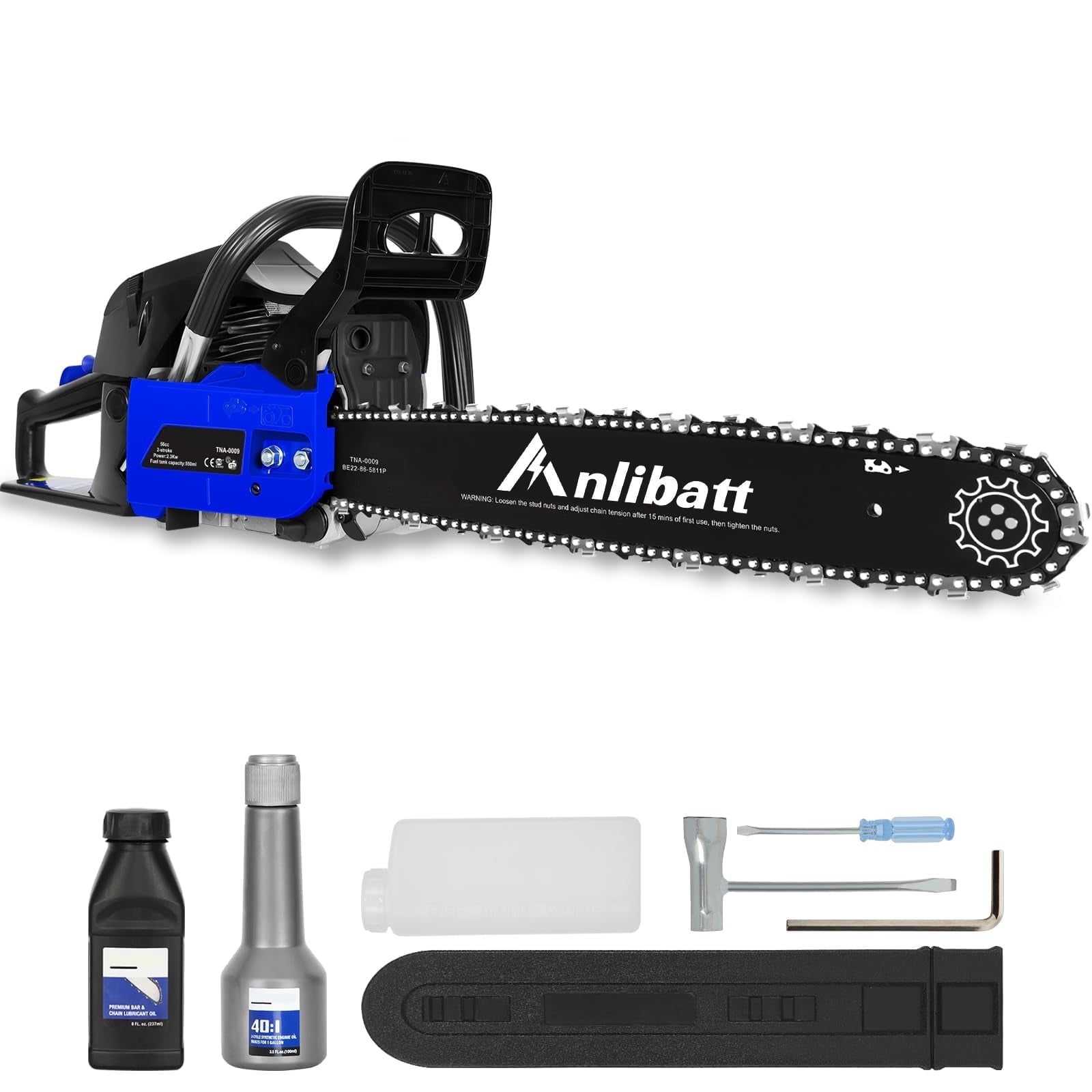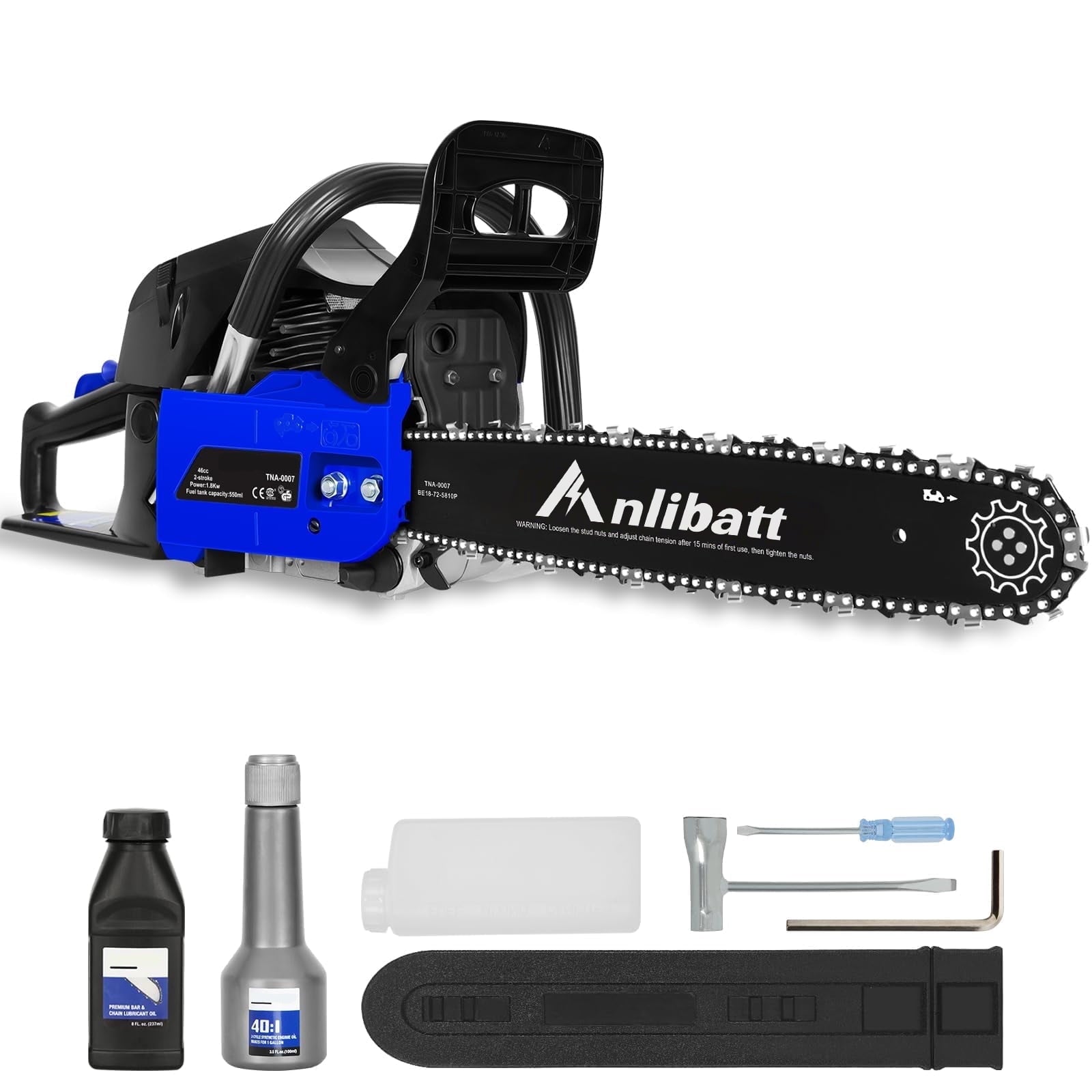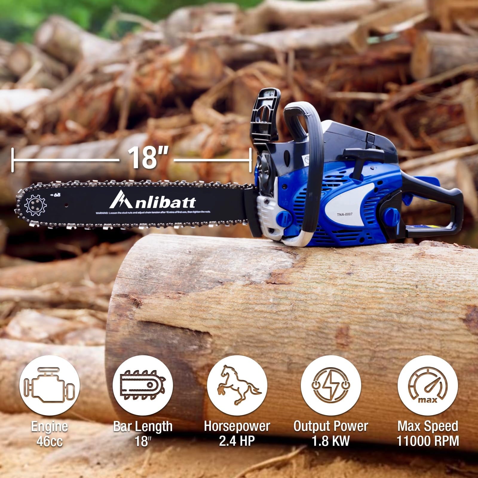 ANLIBATT Gas Chainsaw 18″ 46cc 2.4HP 2-Cycle Gas-online Powered Handheld Cordless Chain Saw is the perfect tool for homeowners and DIY enthusiasts. Powered by a 46cc, 2.4 HP, 2-cycle engine, this chainsaw offers the power and performance you need for a variety of cutting tasks. The automatic oiler keeps the chain lubricated for smooth operation, while the 18-inch bar makes quick work of branches and logs. Lightweight and easy to use, this gas chainsaw will make your wood cutting projects a breeze.