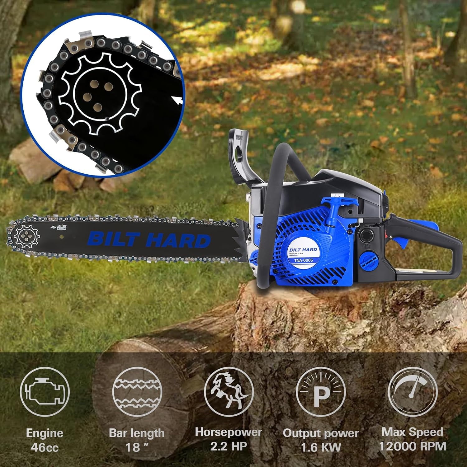 - Smooth & Efficient Cutting Action: Easy pull starts with the recoil starter. The 18-inch bar and chain ensure fast cutting through limbs, while the high-quality carburetor maximizes efficiency and fuel savings