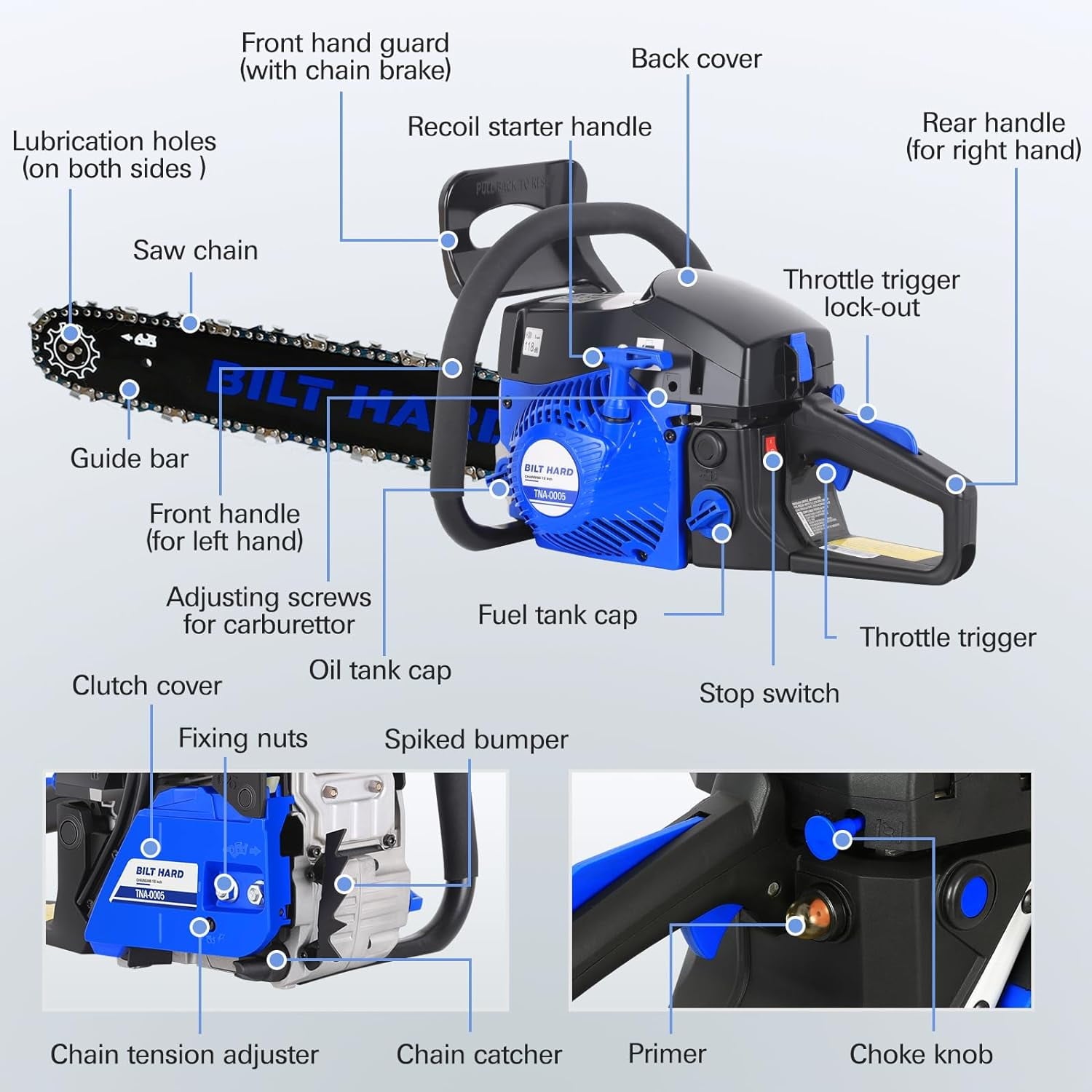 - Durable, User-Friendly Design & Enhanced Safety: Features an air cleaning system for long-lasting performance and an automatic oiler for consistent chain lubrication. The lightweight, ergonomic design and anti-vibration system provide user comfort. Enhanced safety features include low kickback and an automatic, inertia-activated chain brake.