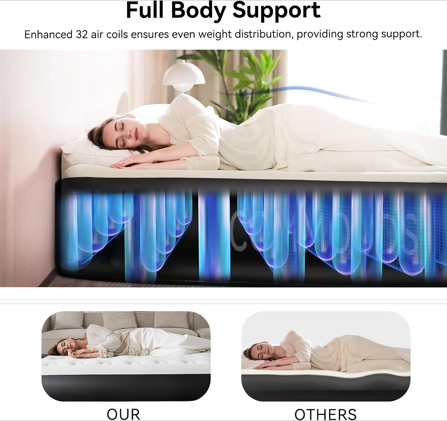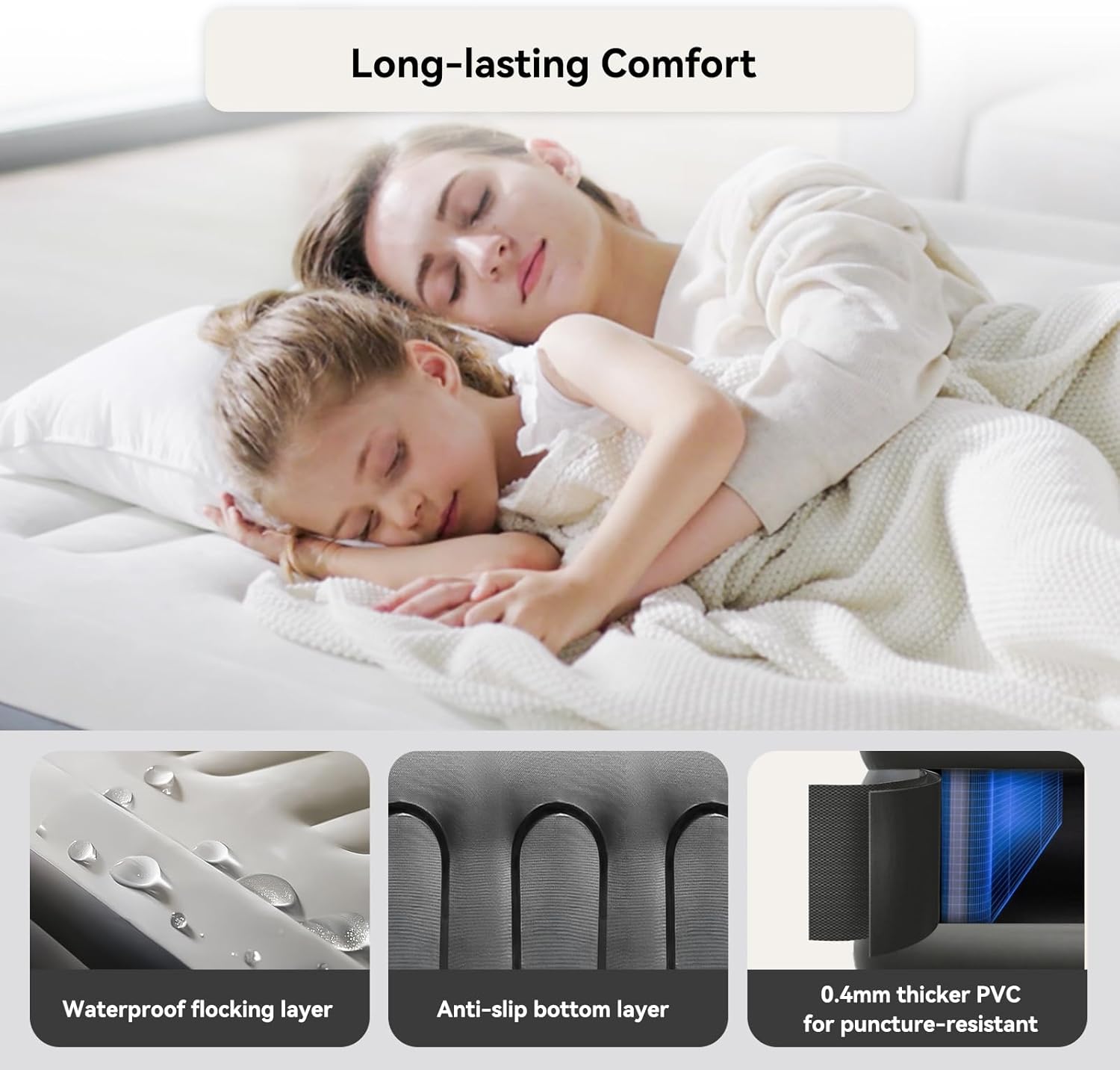 - Upgraded Material: Made from high-density flocked fabric, soft, breathable, and odor-free. 30% thicker PVC ensures long-lasting durability. Leak-resistant and resistant to bulging, it offers a worry-free sleeping experience. It also comes with repair patches for added peace of mind