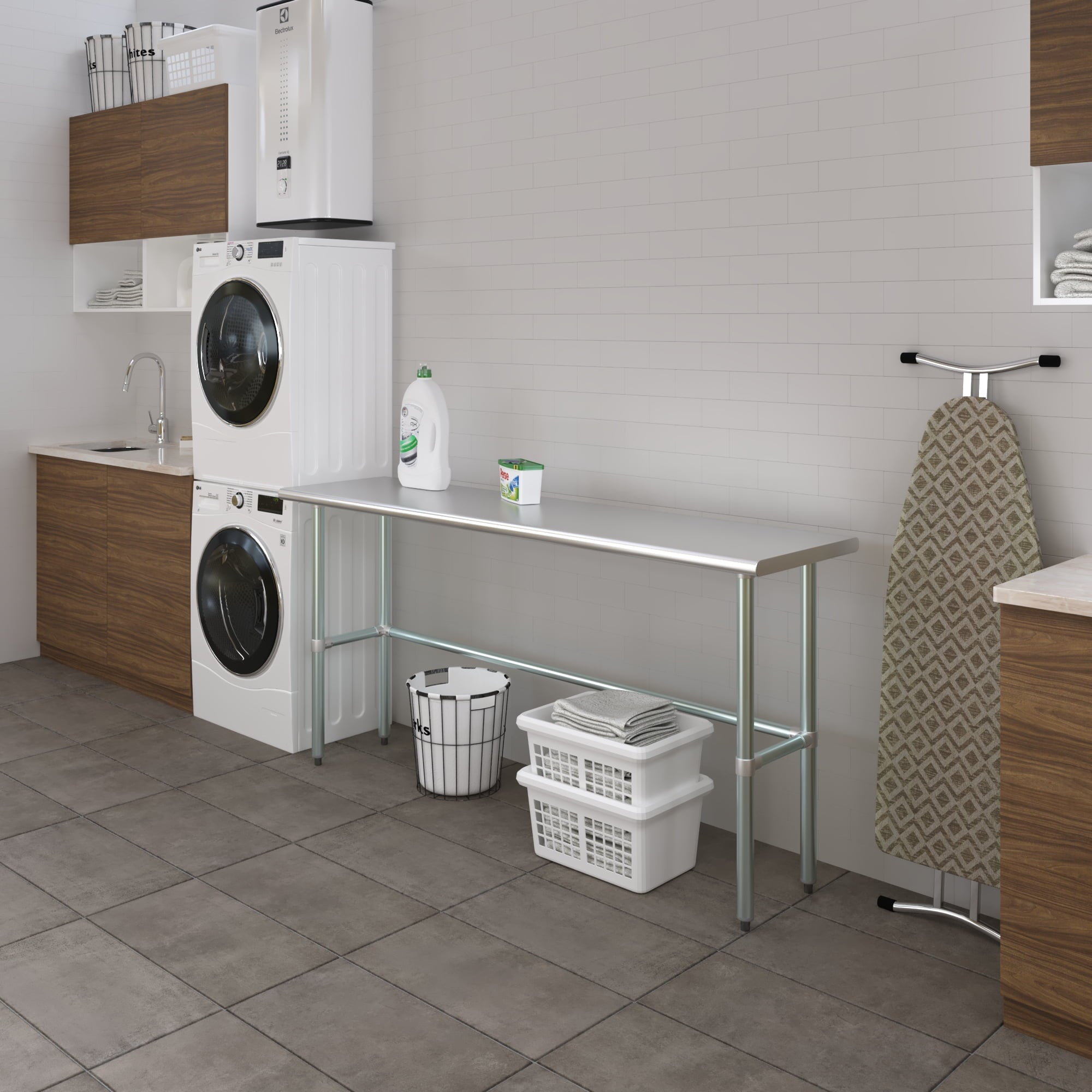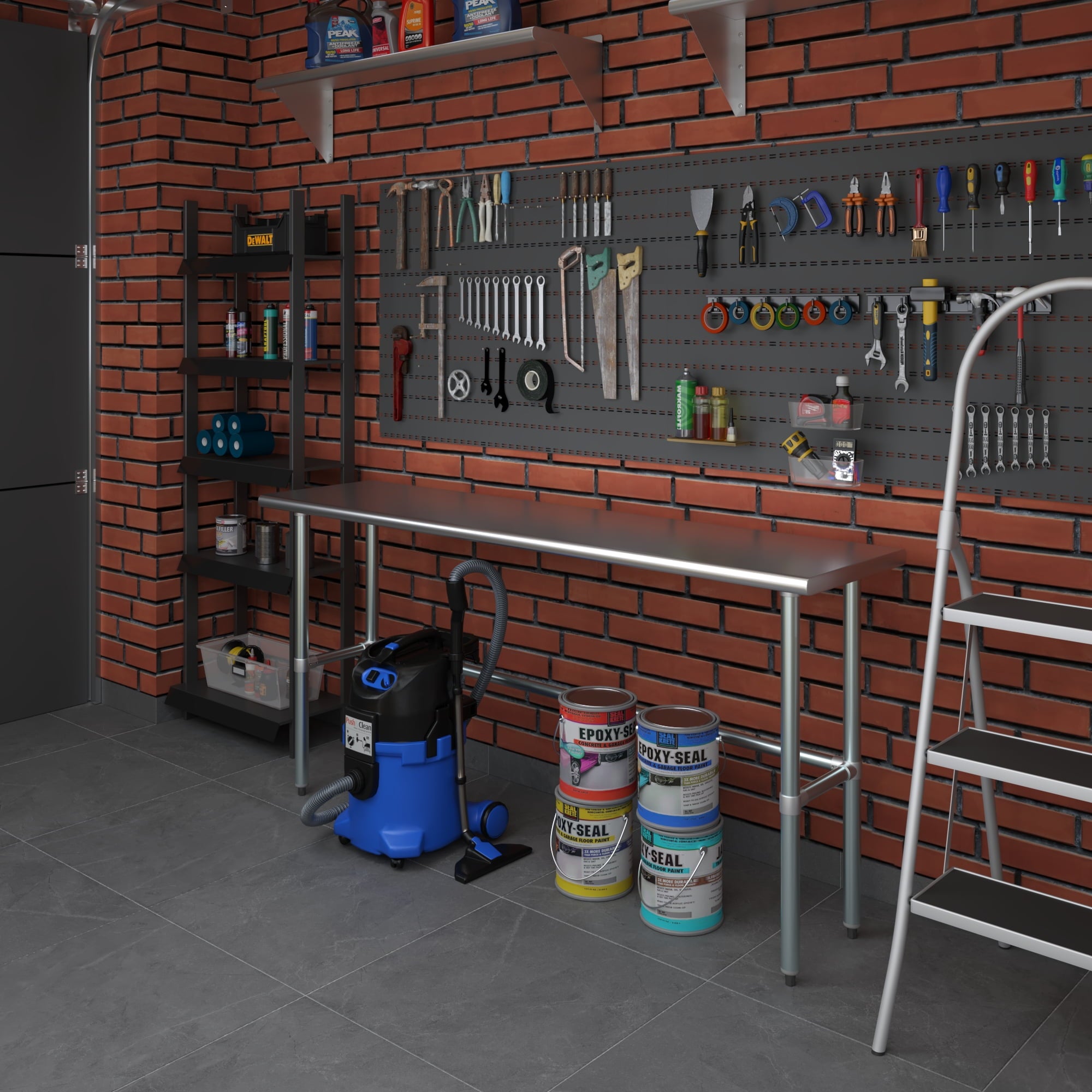 - Aside from food prep, this table can be used for a variety of things. It can double as a garage workbench, a tool bench, a garden or outdoor workbench and table, or a design table for blueprints or architectural planning. It’s great for home projects like sewing, laundry, or crafts and can even be utilized in cafeterias, janitorial rooms, hotels, office buildings, hospitals, veterinarian clinics, and more.