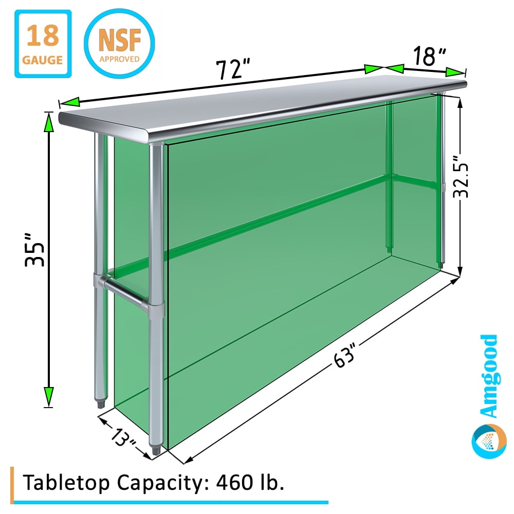 18″ x 72″ AmGood Stainless Steel Work Table is made with T-430 18 gauge stainless steel and is sturdy and stylish to be used in multiple commercial and residential applications. All AmGood work tables are NSF certified. In business, stainless steel tables are commonly used for food prep in commercial kitchens, professional workstations, exam tables for veterinarians, and utility tables in hotels, laundromats, offices, and warehouses all over the United States. Homeowners choose AmGood tables as they can easily be used as kitchen islands, counter extensions, garage workbench, laundry clothes folding tables, etc. The table comes with a galvanized undershelf, which provides extra storage space underneath the table.