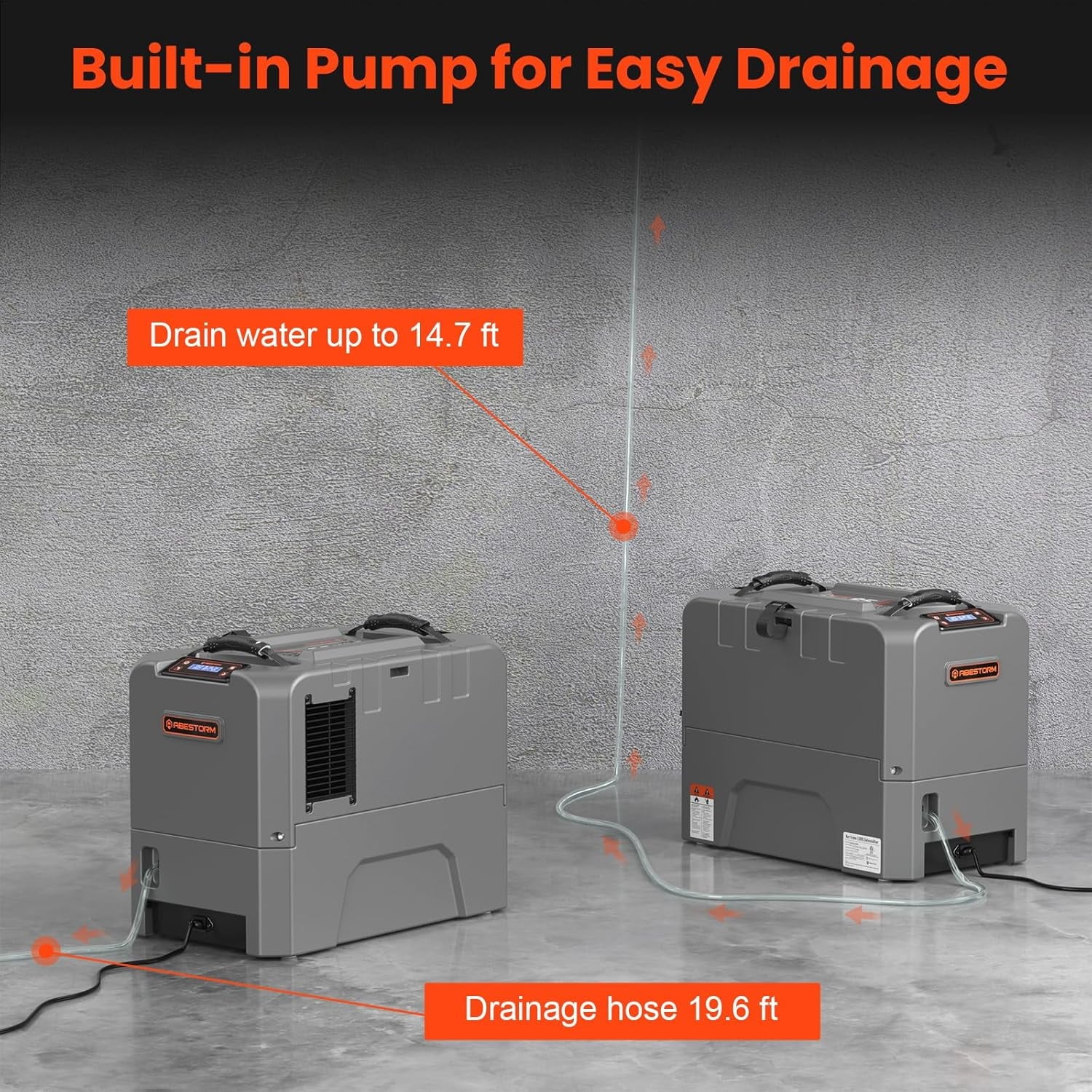 - Built-in pump automatically collects and pumps out condensate water, eliminating manual emptying, with a pump discharge height up to 14.7 ft, ideal for basements or other large spaces.