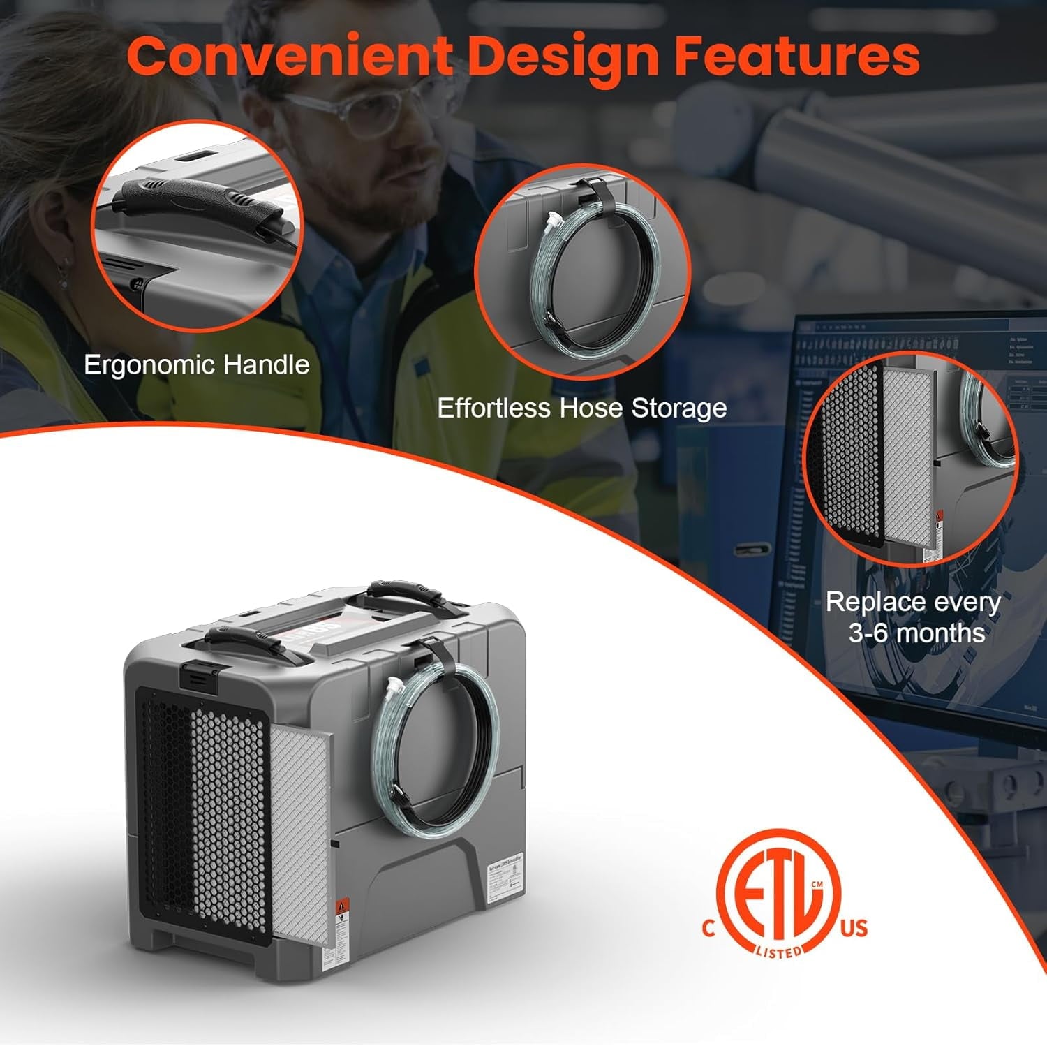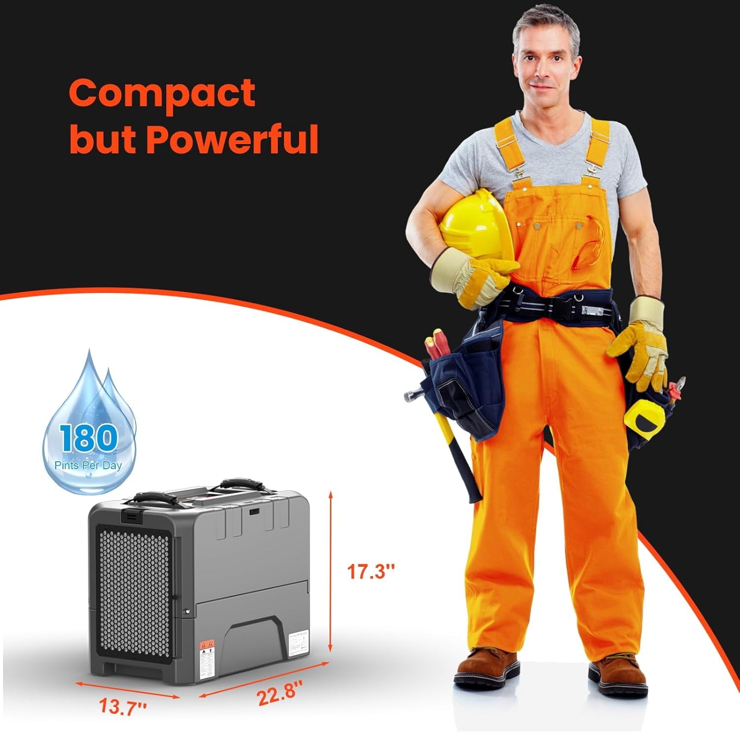 - Highly efficient dehumidification with an airflow rate of 210 CFM, which can remove up to 180 pints of airborne moisture per day at saturated conditions and 85 pints per day at AHAM, making it suitable for coverage areas up to 2300 square feet.