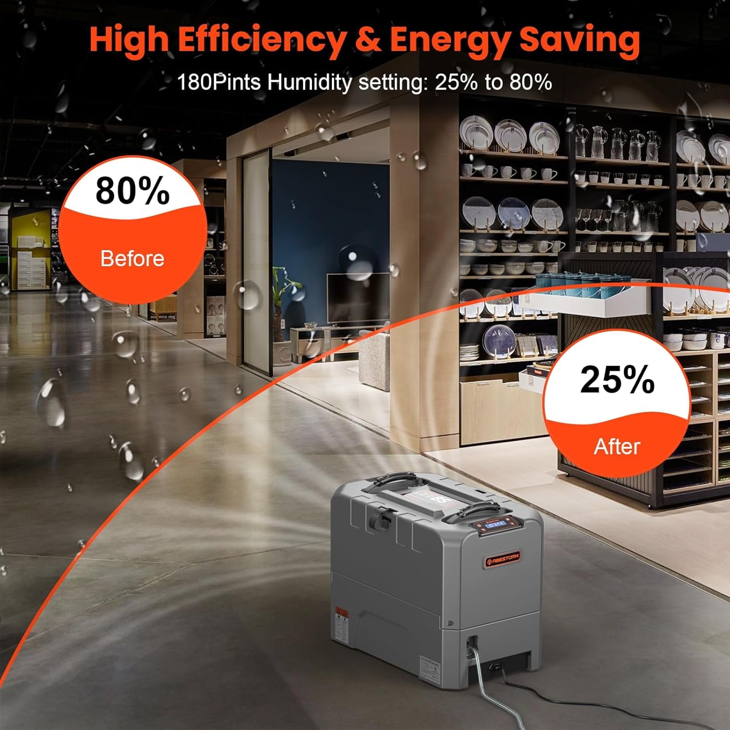 This powerful 180-pint commercial dehumidifier efficiently removes excess moisture from large spaces up to 2,300 square feet. Its built-in pump automatically drains condensate water, eliminating manual emptying. With auto on/off, auto defrost, and auto restart features, this compact and stackable dehumidifier is easy to use and ideal for basements, warehouses, and other large areas. Backed by a warranty, this industrial-grade dehumidifier provides reliable and hassle-free moisture control.