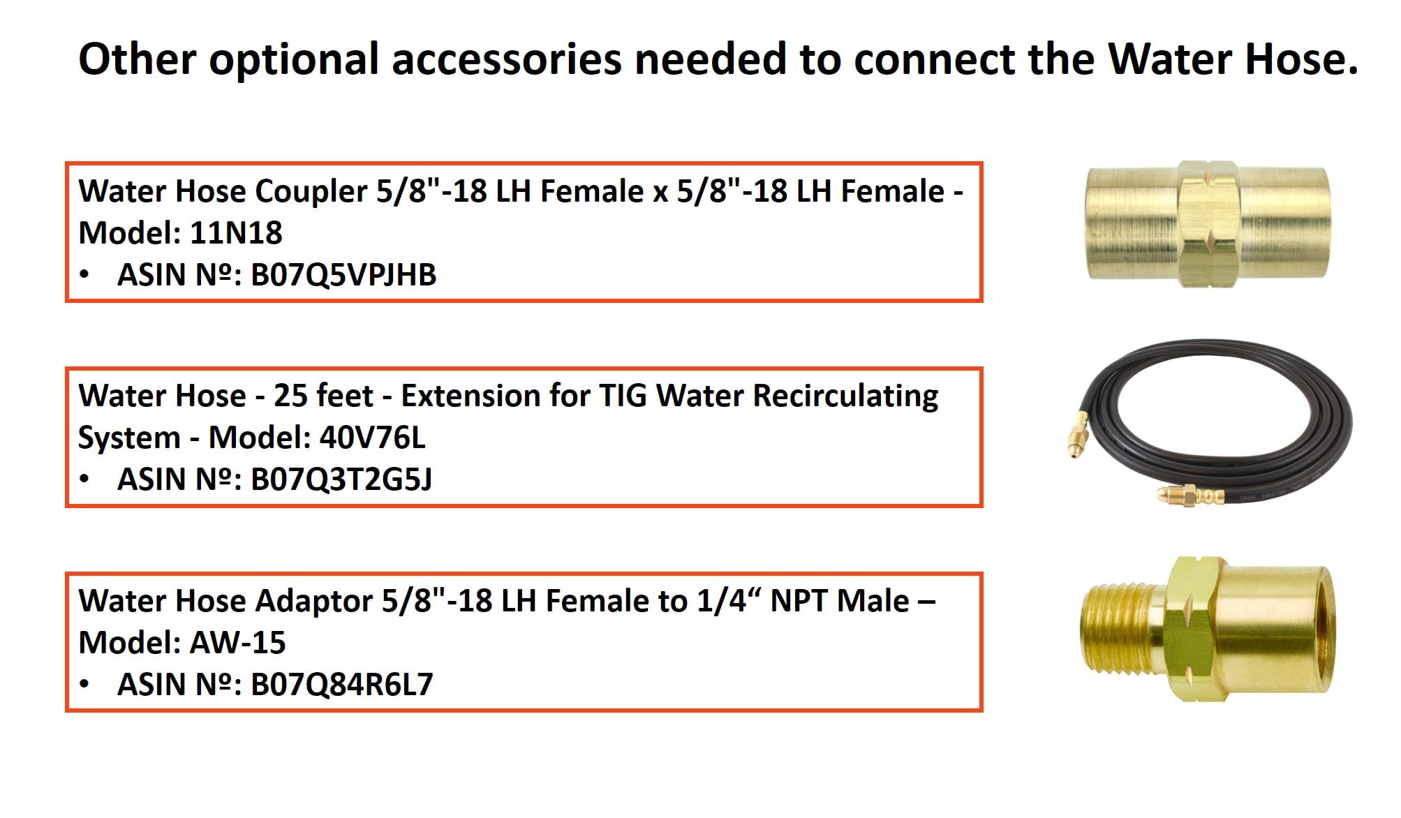 - Choose between Dinse 35-70 or Stud Connectors. Dinse connector comes with 18″ water hose with 5/8″-18 LH Male Water Fitting and Stud Connector has 5/8″-18 LH Female Water Fitting (Please check Picture #2 and #3 for dimensions and Table in Picture #6 for a list of compatible welders)
