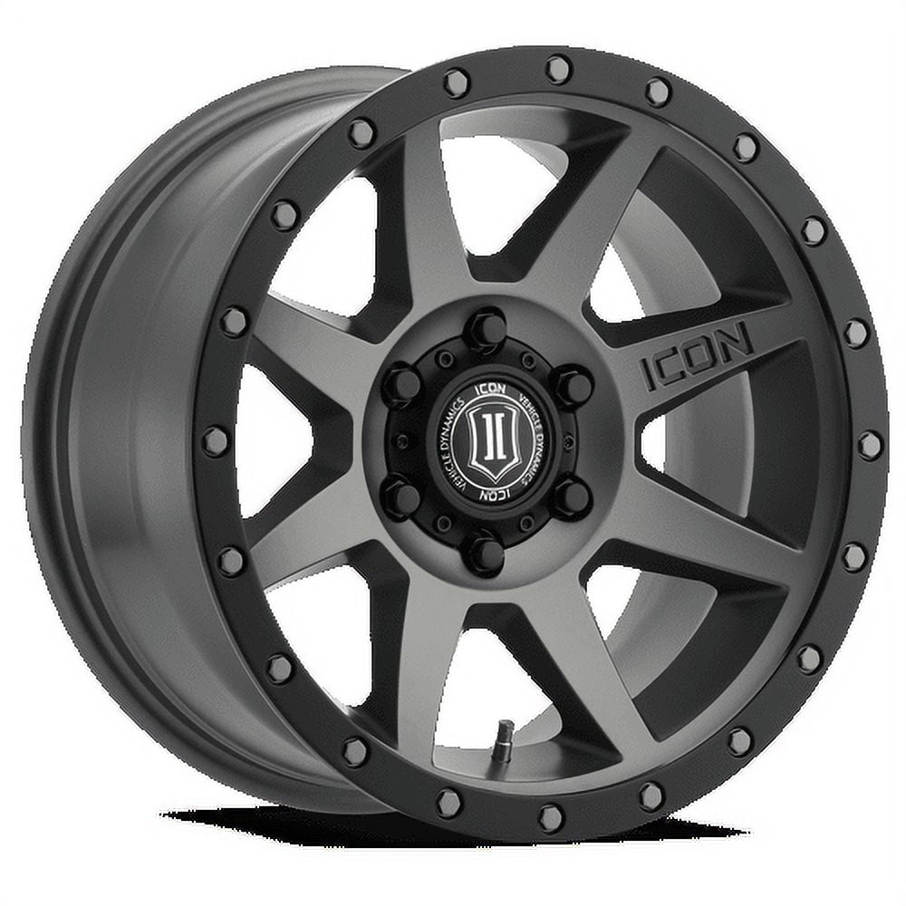 ICON ALLOYS REBOUND TITANIUM – 18 X 9 / 6 X 5.5 / 25MM / 6″ BS. ICON ALLOYS REBOUND TITANIUM – 18 X 9 / 6 X 5.5 BOLT PATTERN / 25MM OFFSET / 6″ BACKSPACE / 95.1MM HUB BORE. ICON Alloys is pround to announce new 18×9″ sizes of the popular ‘Rebound’ wheel designed for optimal fitment on todays popular midsize, full-size and heavy-duty pickup trucks. Available in five, six and eight lug patterns and with application-specific fitment dimensions, these new wheels yield a 2,750-pound load rating for the five and six-lug versions and a 4,000-pound load rating on the eight-lug version, maintaining ICON Alloys commitment to producing wheels that deliver style and strength.. The 18×9 ‘Rebound’ wheel is designed to enhance a trucks appearance and handling with its application-optimized backspacing for better wheel fitment, maximized caliper clearance, reduced scrub radius and unhindered suspension travel improving all-around handling and ride quality. Constructed using a high-strength aluminum alloy, the 18×9 ‘Rebound’ will deliver the strength needed to withstand off-road excursions and towing/hauling duty.18×9 Icon Alloys Rebound Titanium Wheel 6×5.5 (25mm)