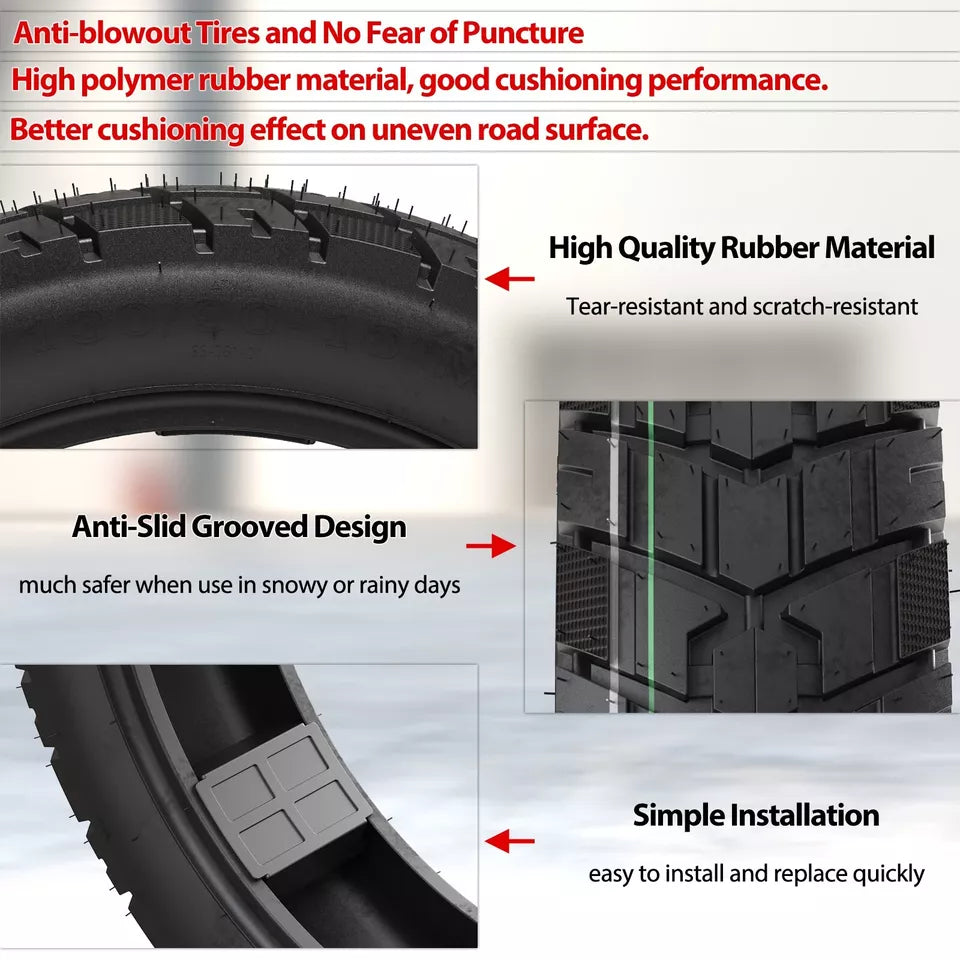 Feature:Fine Quality Rubber Tyre: Non inflatable tubeless tyre is professionally made of high quality rubber, with good friction resistance, strong and durable, long service life. And the rubber tire is soft and stable, so as to better guarantee the safety performance and riding comfort.Prevent Punctures: Non inflatable vacuum tires do not require inner tubes, are easy to install and disassemble, and prevent punctures.Excellent Grip for Any Weather: Rubber tire has concave and convex texture on the surface, it provides good grip and slip resistance, making it suitable for use in snowy and rainy days and safe riding in all kinds of complicated road conditions.Strong Shock Absorption: The vacuum tire has good impact resistance and cushioning, it can provide a comfortable and stable driving experience.