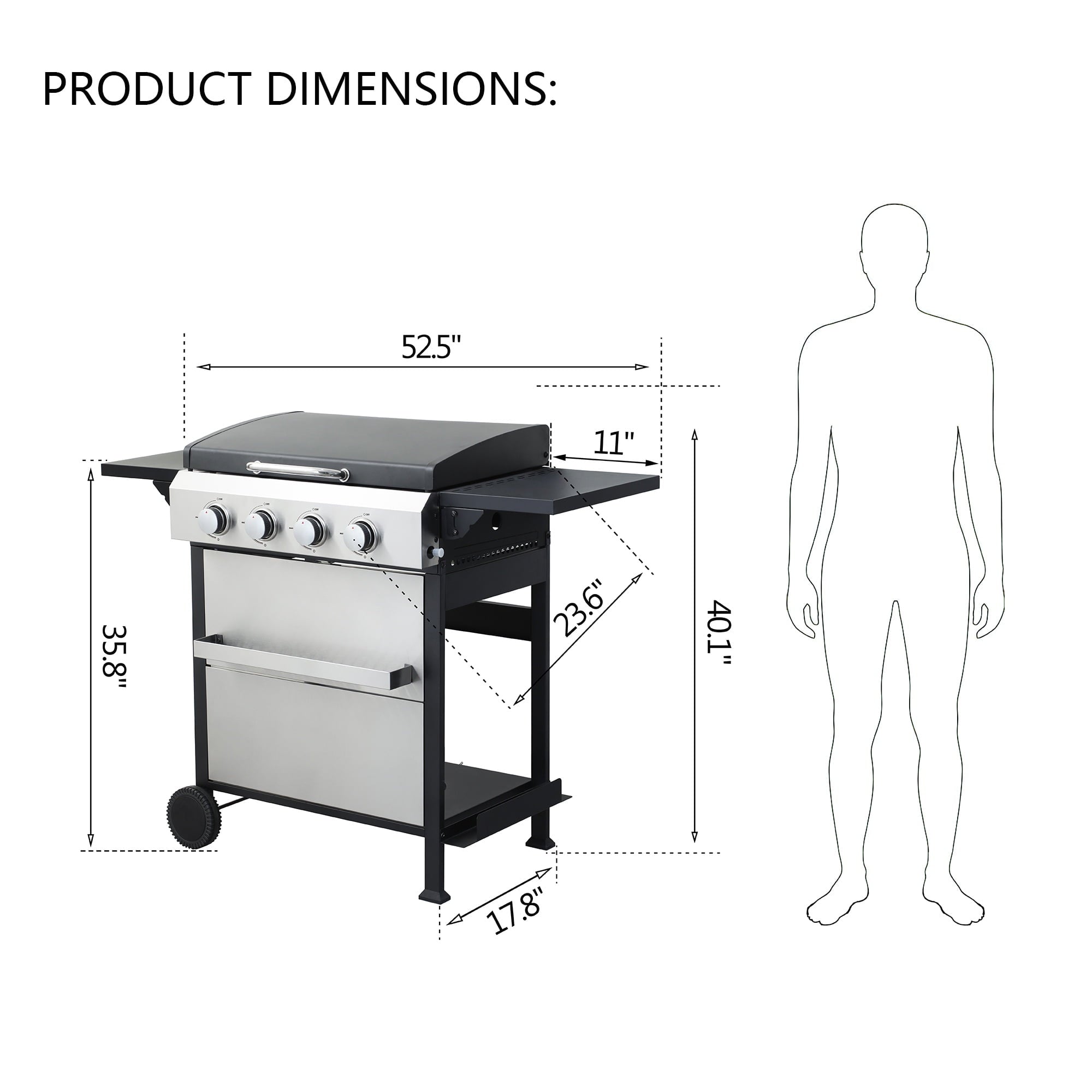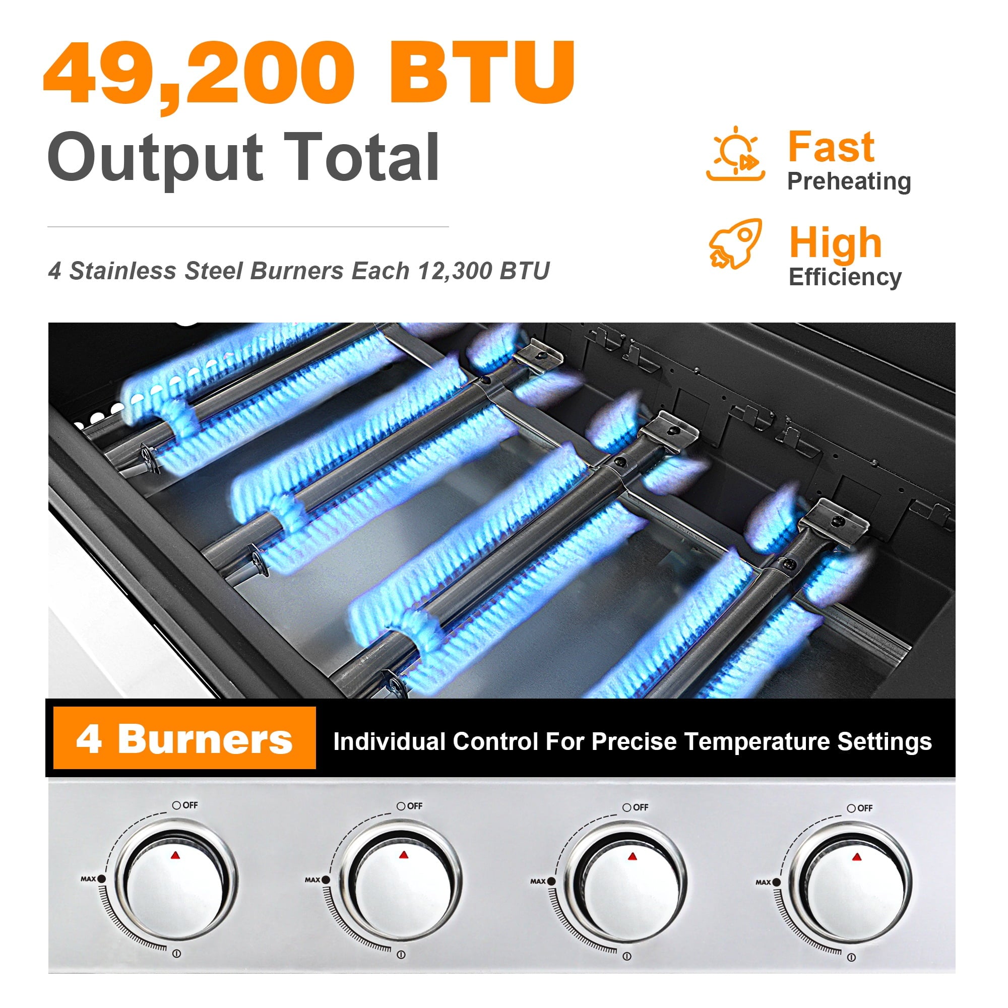 • 【High Performance】Our propane gas grill boasts 4 independently controlled burners that provide 49,200 BTU (12,300 BTU each) and even heat distribution across both the grill and griddle surfaces, allowing you to cook multiple items simultaneously.