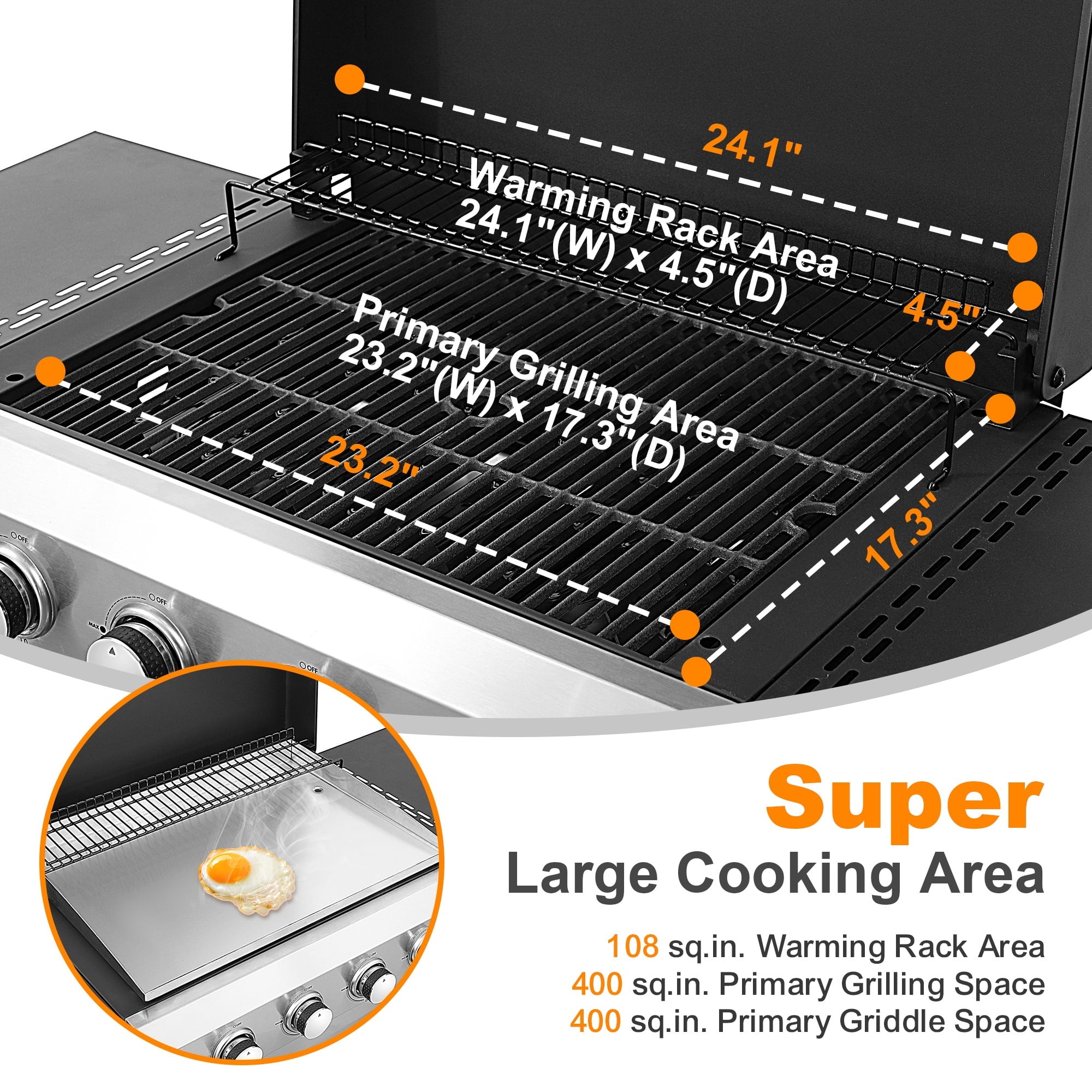 • 【Ample Cooking Space】Total of 508 sq. in. cooking space, this gas BBQ grill offers 400 square inches on the main grill and 108 square inches on the warming rack providing ample cooking area.