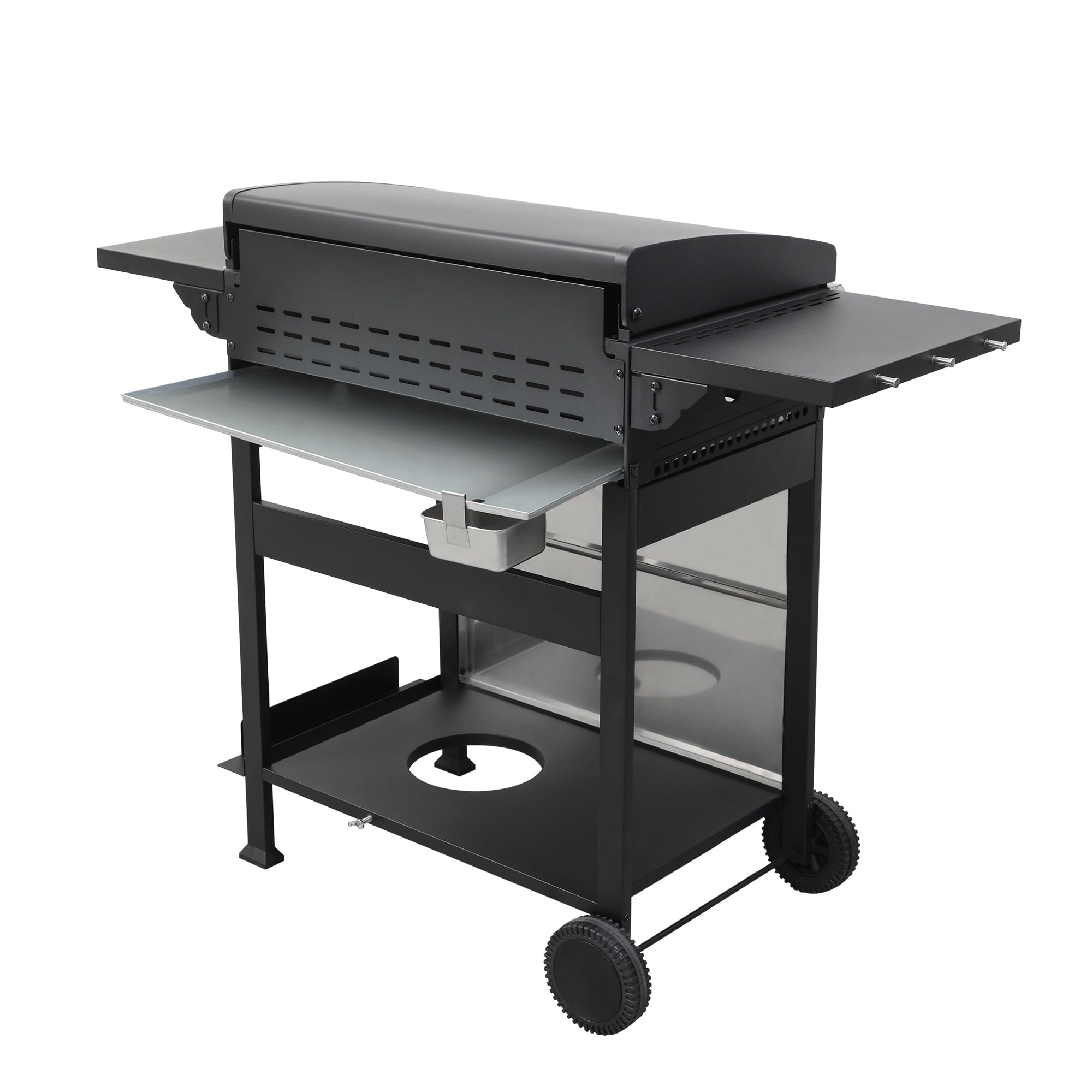 • 【Extra Convenience】The hooks on the side tables are specially designed for hanging grill tools, and the front hanging basket can store condiment bottles.  A griddle storage area provides convenience.