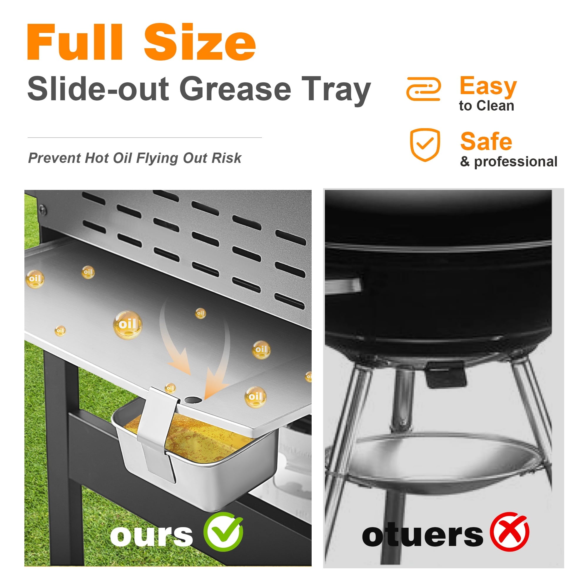 • 【Collapsible Side Tables】Our griddle grill combo features two side tables that provide additional workspace to place dishes, and condiment bottles. The tables are also easy to fold for storage when not in use.