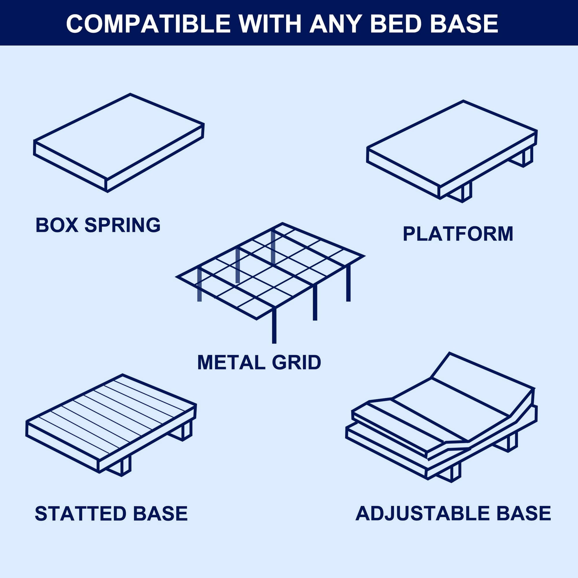 [Compatible with Any Bed Base] It can be placed on top of any box spring or platform bed. With the durable and thick layer of plush and conforming memory foam on the top, your bed will be the perfect combination of comfort and support.