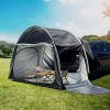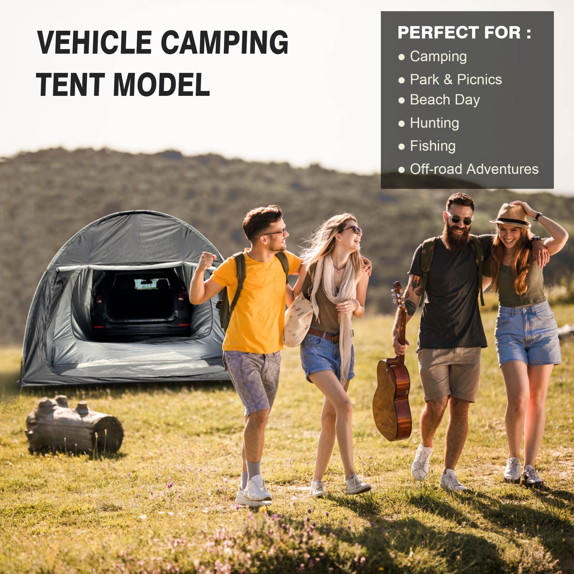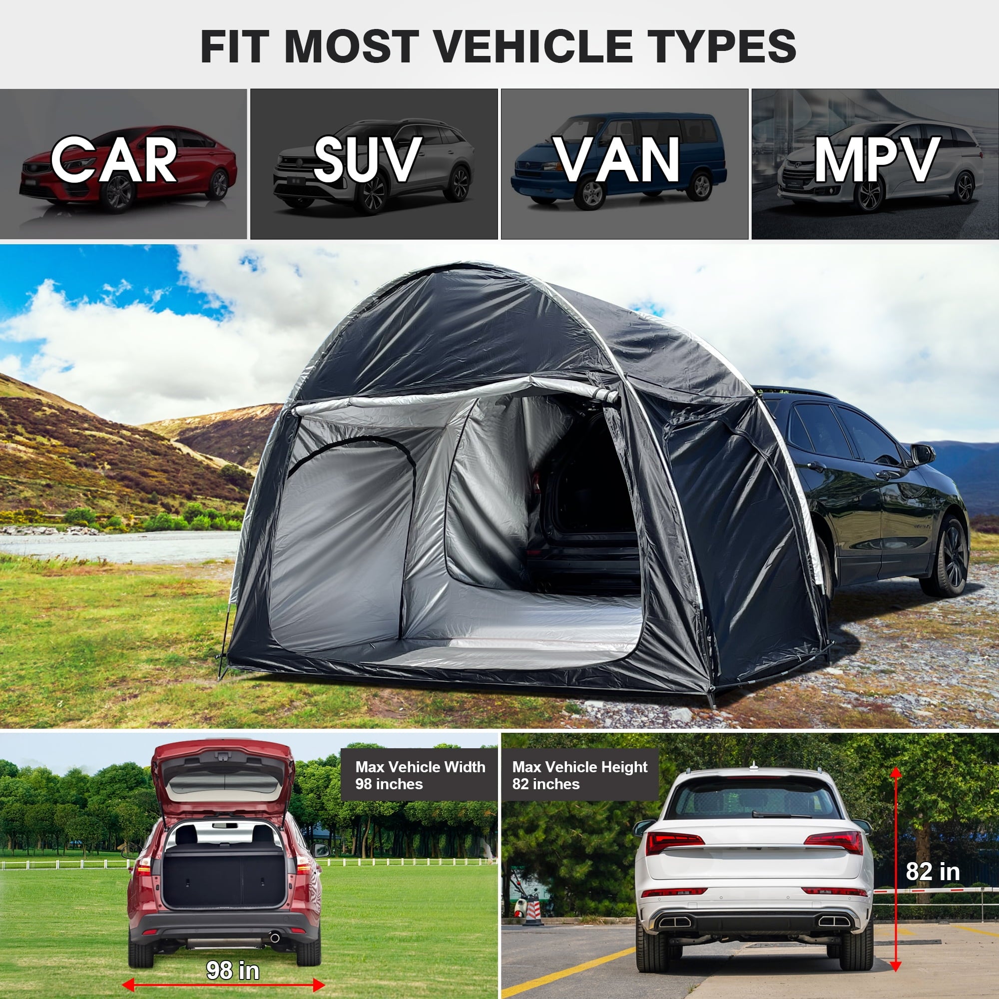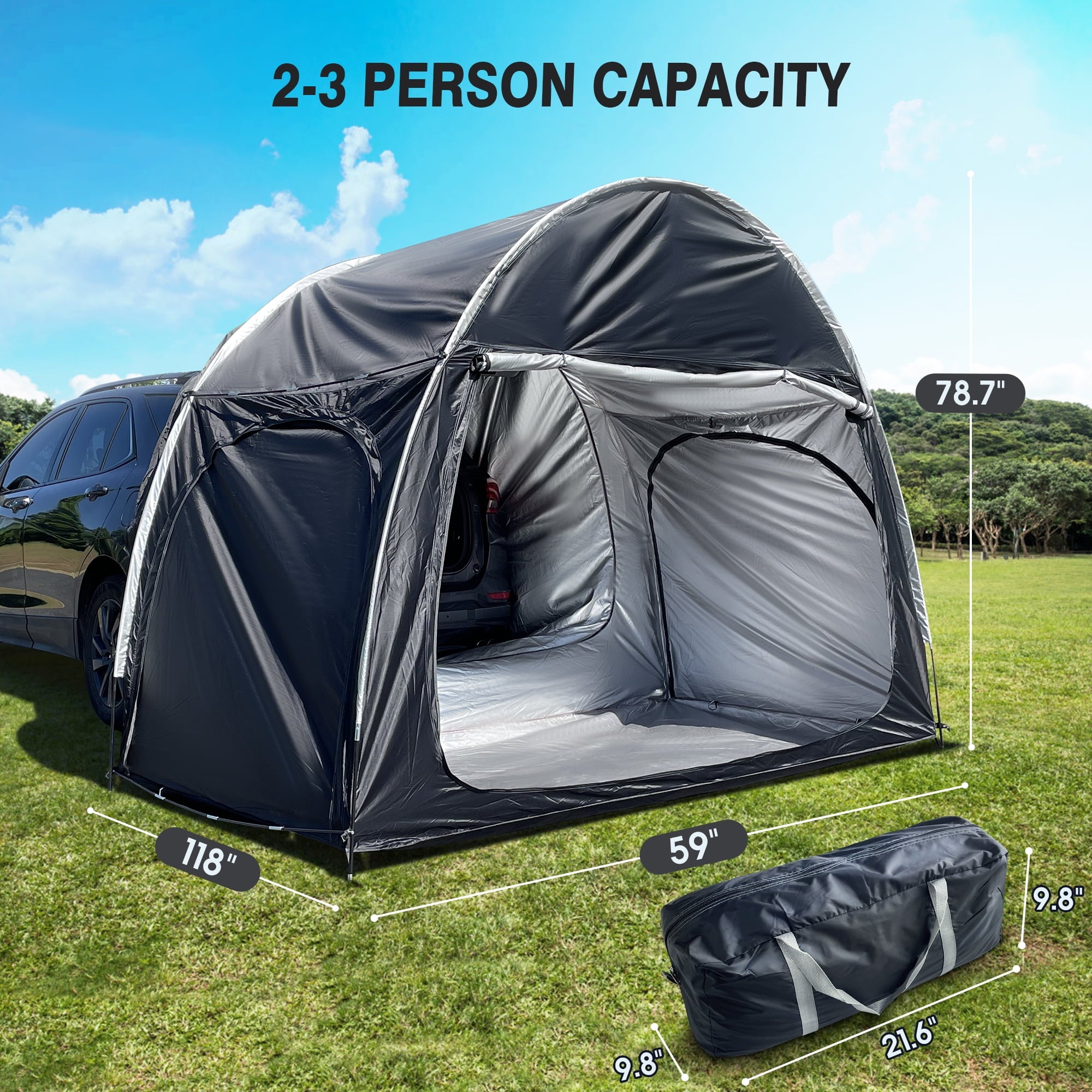 This spacious vehicle camping tent (118″W x 59″L x 78.7″H) features standing-height clearance, comfortably accommodating 2-3 adults. Universally compatible with SUVs, vans and MPVs, it includes three roll-up zippered doors for optimal ventilation and panoramic views. The versatile design converts between open-air shelter and enclosed private space, while seamlessly integrating with your vehicle’s rear compartment for expanded sleeping quarters, storage or power access. Lightweight yet durable, it’s perfect for everything from music festivals to overnight camping adventures, with quick setup and easy portability making it an ideal outdoor companion.