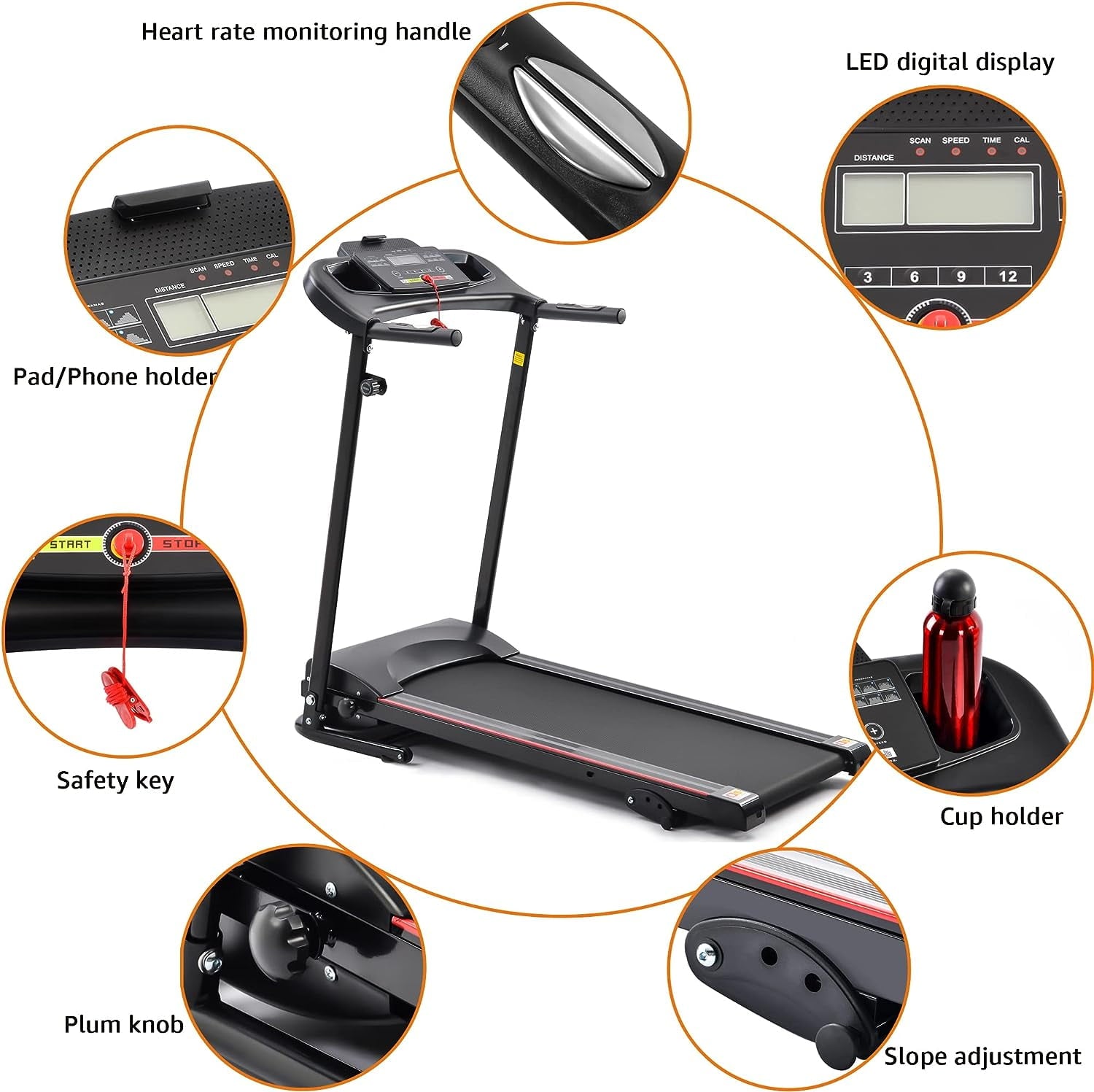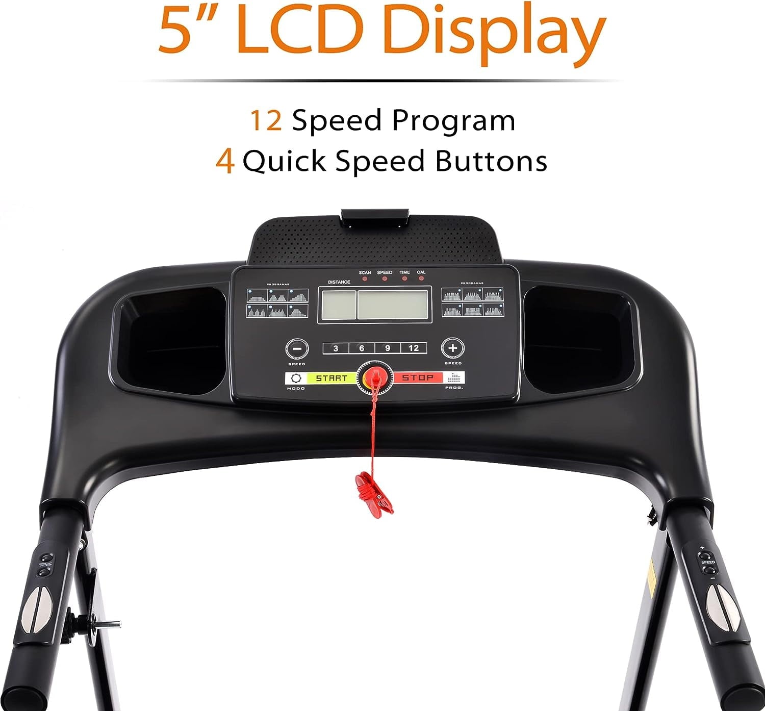 - 10MPH Max. Speed & 12 Programs|Enjoy a quiet workout with a powerful motor perfect for walking, jogging and running in the comfort of your own home.|User-friendly console allow you to track real-time data on speed, time, distance, calories and heart rate.|Integrated device deck thatâs compatible with most smart devices. Listen to the music from your smart device through the speakers on the console.|Compact folding design with easy lift and transport wheels so that you can fold up your treadmill after workout and roll it away for simple storage. 3 Manual incline options available.|LCD & Heart Rate Monitor â Large LCD console displays real-time speed, distance, duration, calories burnt and pulse, so you could keep a record of your progress over time. Meanwhile, the audio speakers help enhance your fitness experience by playing out loud your favorite playlist, so you donât have to worry about the earphones or headphones.