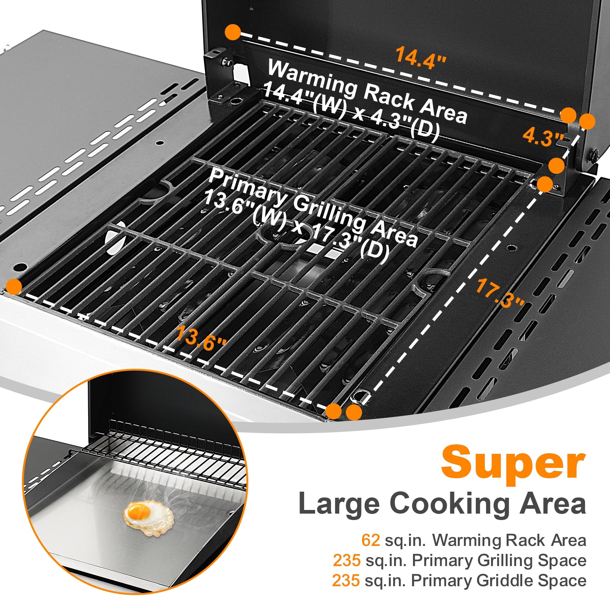 【Ample Cooking Space】Total of 325 sq. in. cooking space, this gas BBQ grill offers 235 square inches on the main grill and 90 square inches on the warming rack providing ample cooking area.