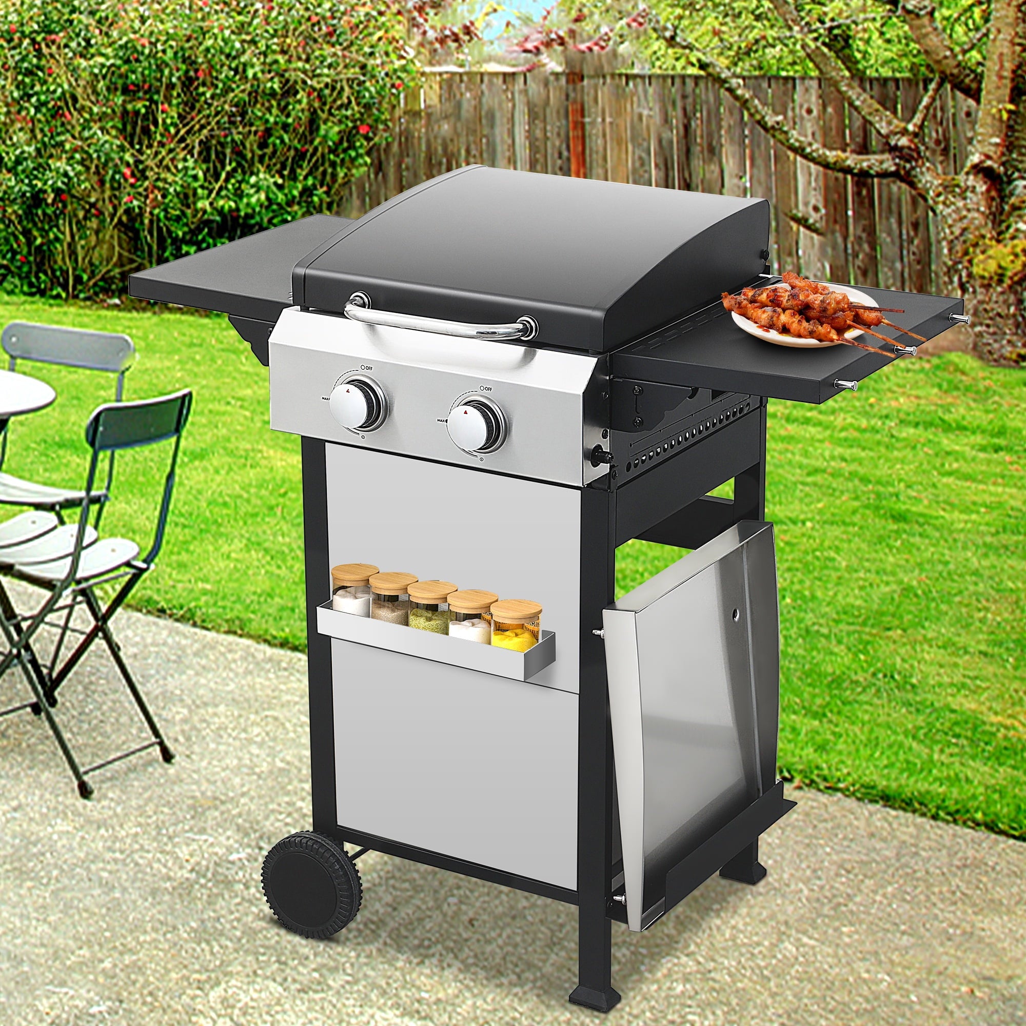 【Extra Convenience】The hooks on the side tables are specially designed for hanging grill tools, and the front hanging basket can store condiment bottles. A griddle storage area provides convenience.
