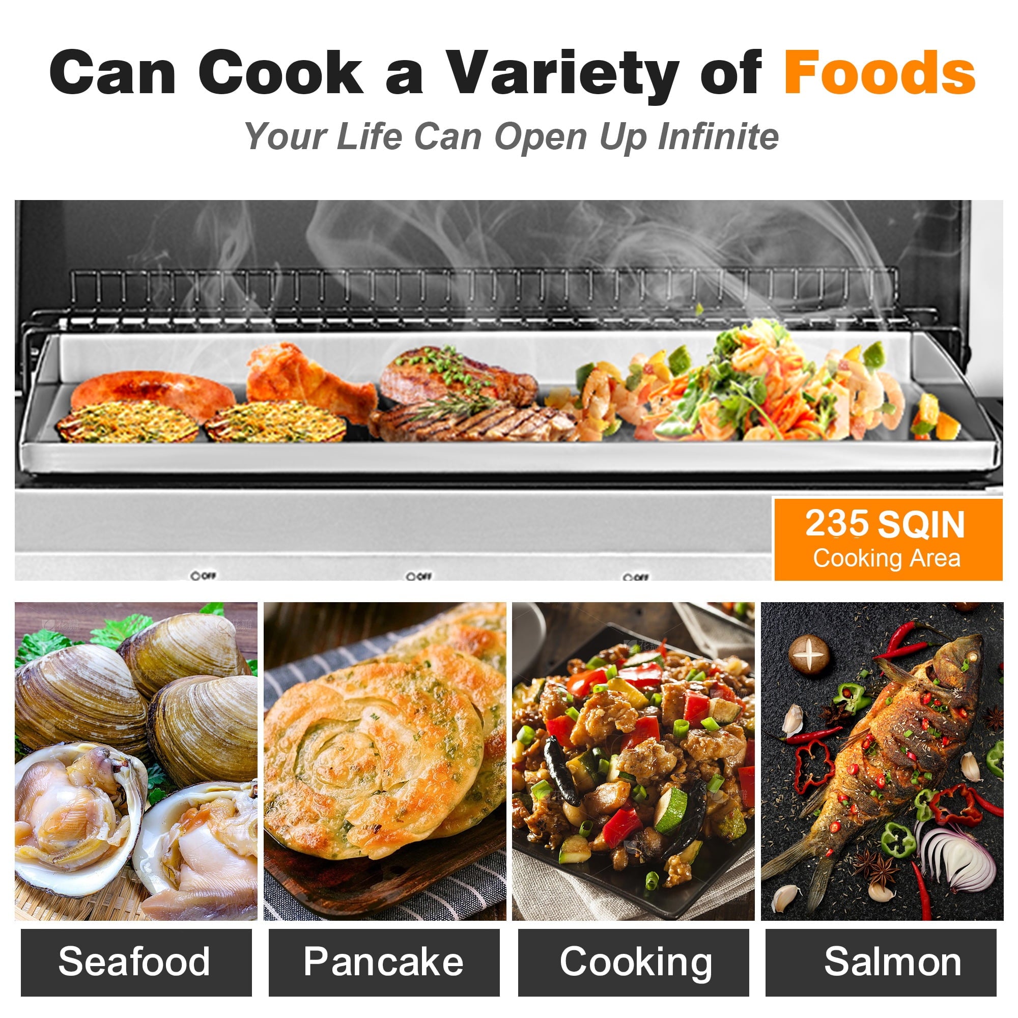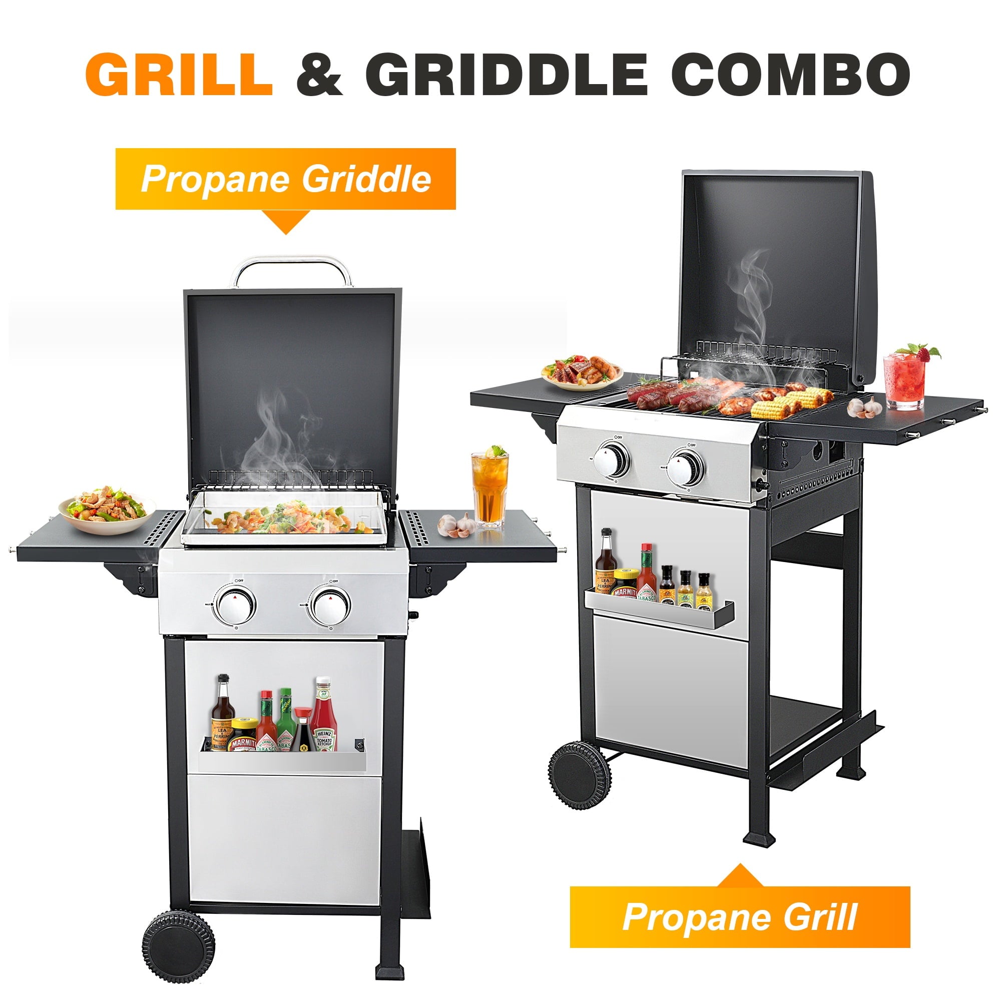 【Collapsible Side Tables】Our griddle grill combo features two side tables that provide additional workspace to place dishes, and condiment bottles. The tables are also easy to fold for storage when not in use.