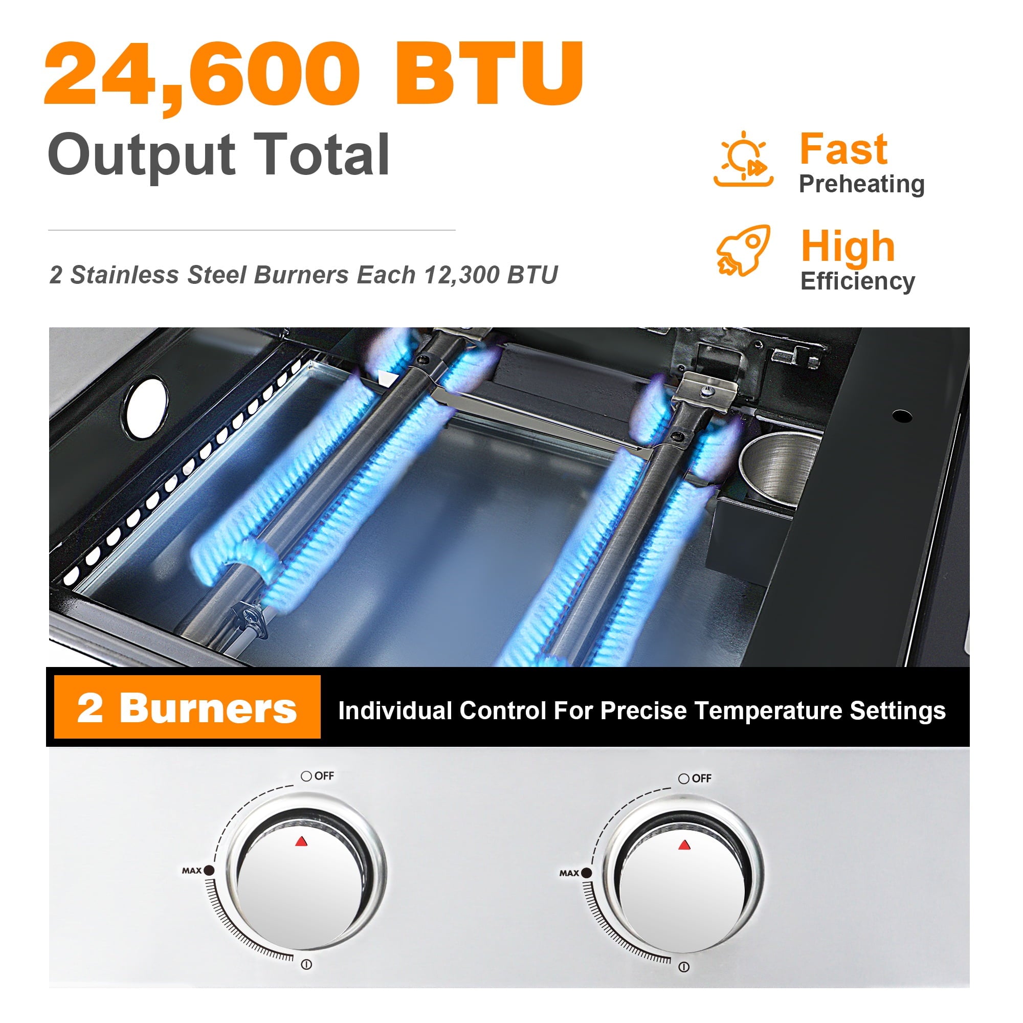 — 24,600 BTU output total, 2 individual control burners & flame tamer offer more cooking ability
