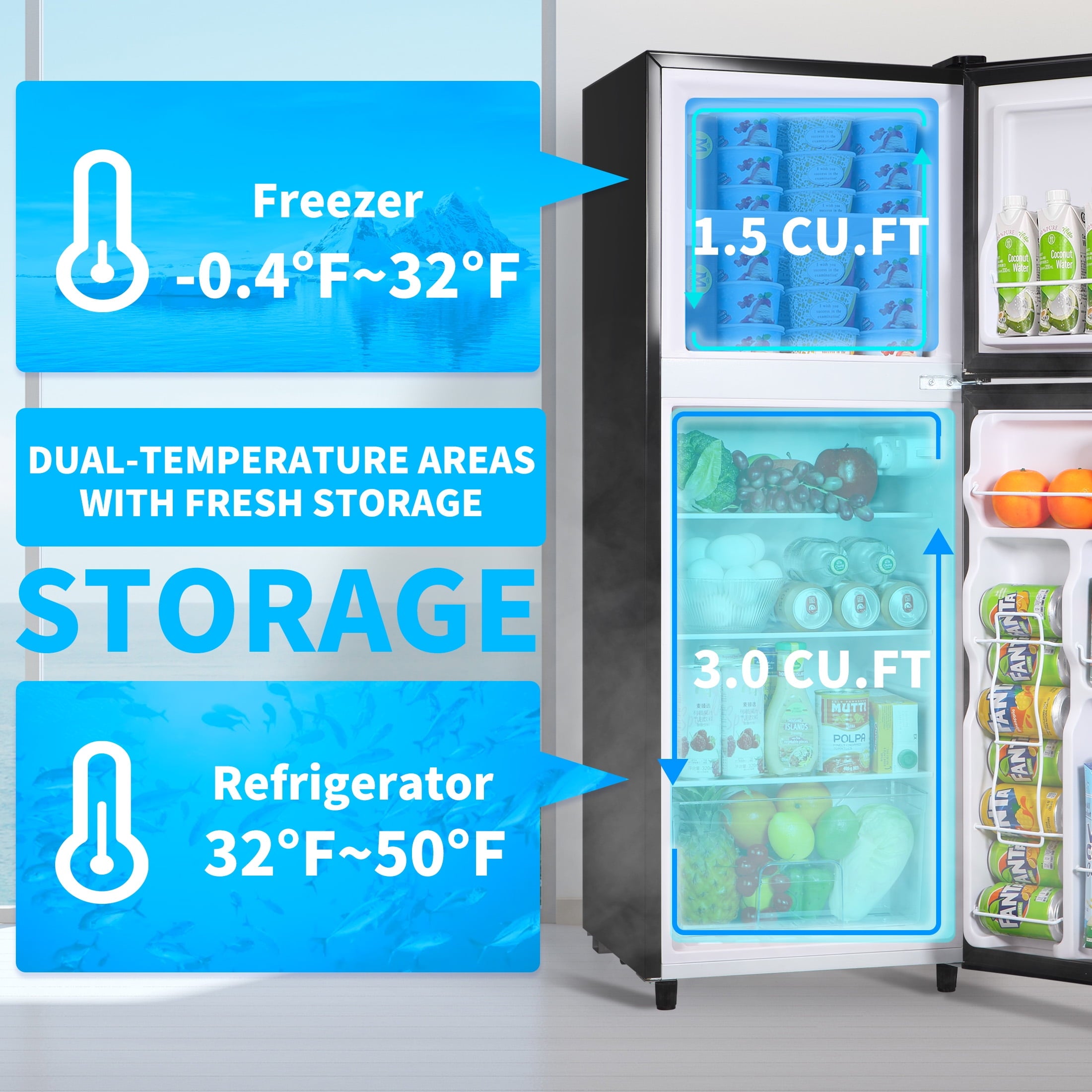- THE WANAI MINI FRIDGE WITH FREEZER brings together the ideal blend of fridge and freezer functionalities in a stylish 2-door design, specifically crafted for dorm rooms. It features dual storage compartments, offering a spacious 1.5 Cubic Feet freezer section that’s perfect for keeping ice cream, frozen meals, and other frozen goods. Additionally, the generous 3.0 Cubic Feet fridge section is ideal for preserving fresh fruits, vegetables, and chilled beverages. By acquiring this mini fridge, you gain the dual advantages of both a fridge and a freezer in a single, convenient appliance – a remarkable value for your living space!