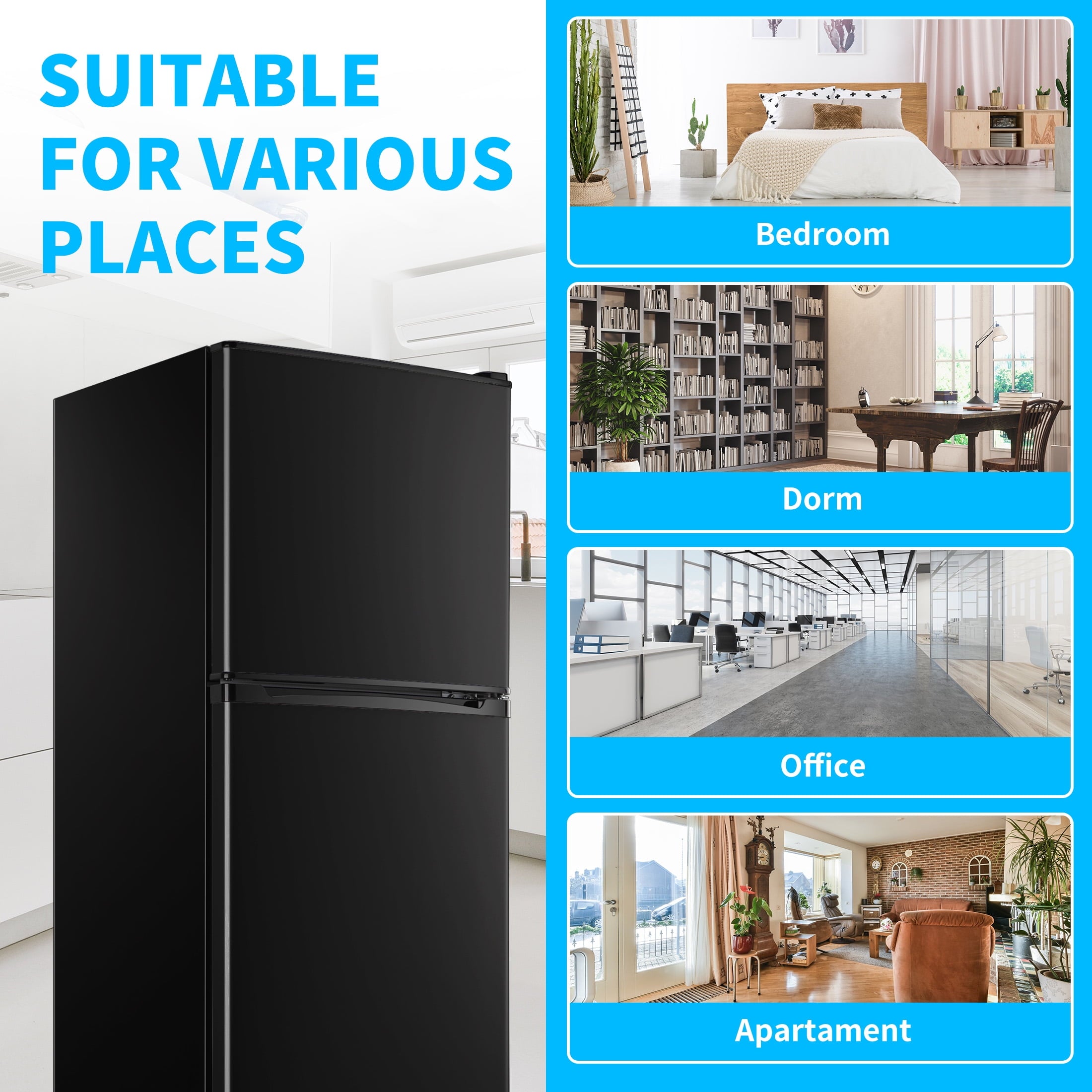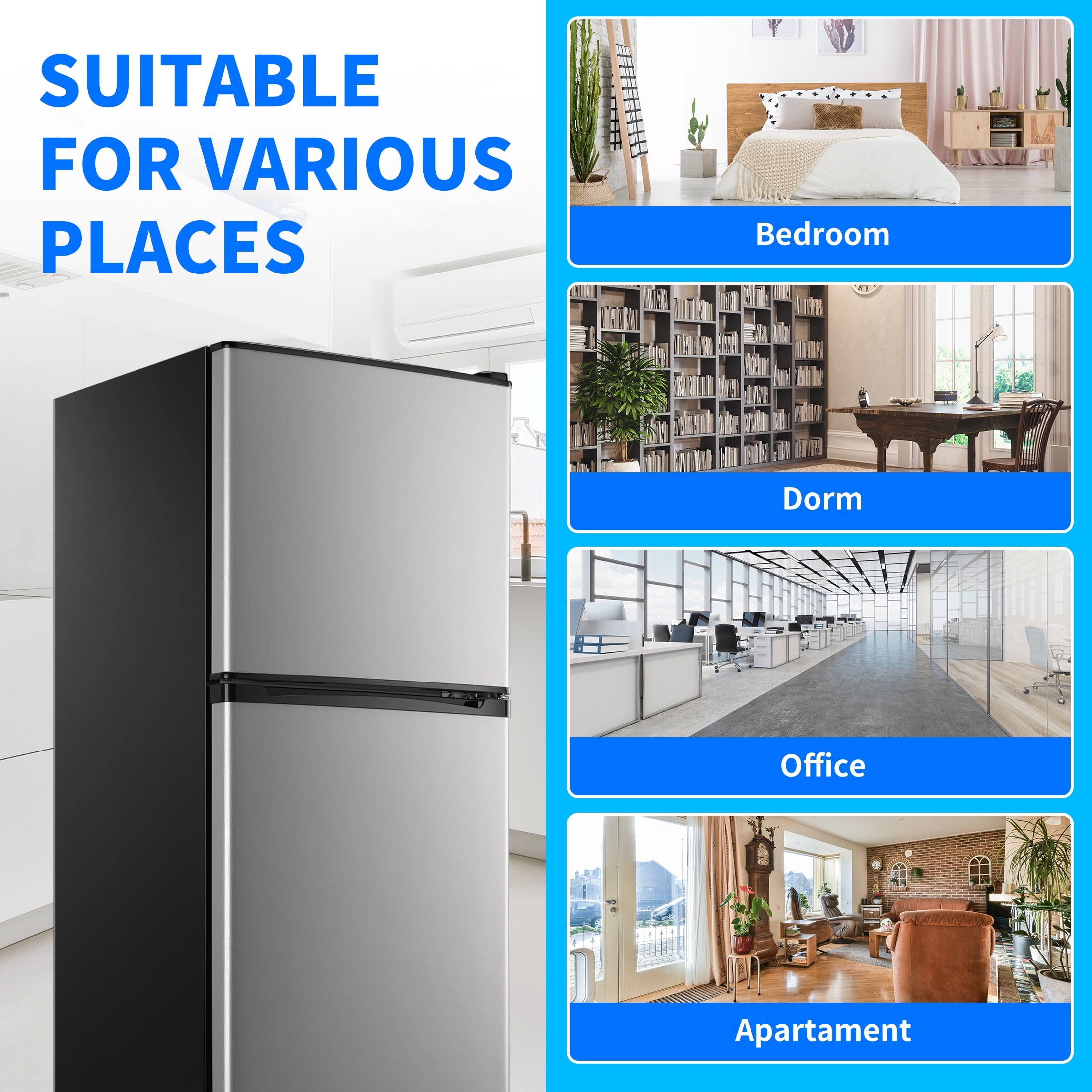 - VERSATILE FEATURES & USER-FRIENDLY DESIGN: The refrigerator’s reversible door offers flexibility, making it suitable for various placements in your room and giving you the freedom to choose your preferred door-opening direction. Its adjustable feet ensure stable and horizontal placement, preventing any wetness on the floor. Ideal for diverse environments, this small refrigerator is perfect for families, dormitories, bedrooms, offices, apartments, and garages.