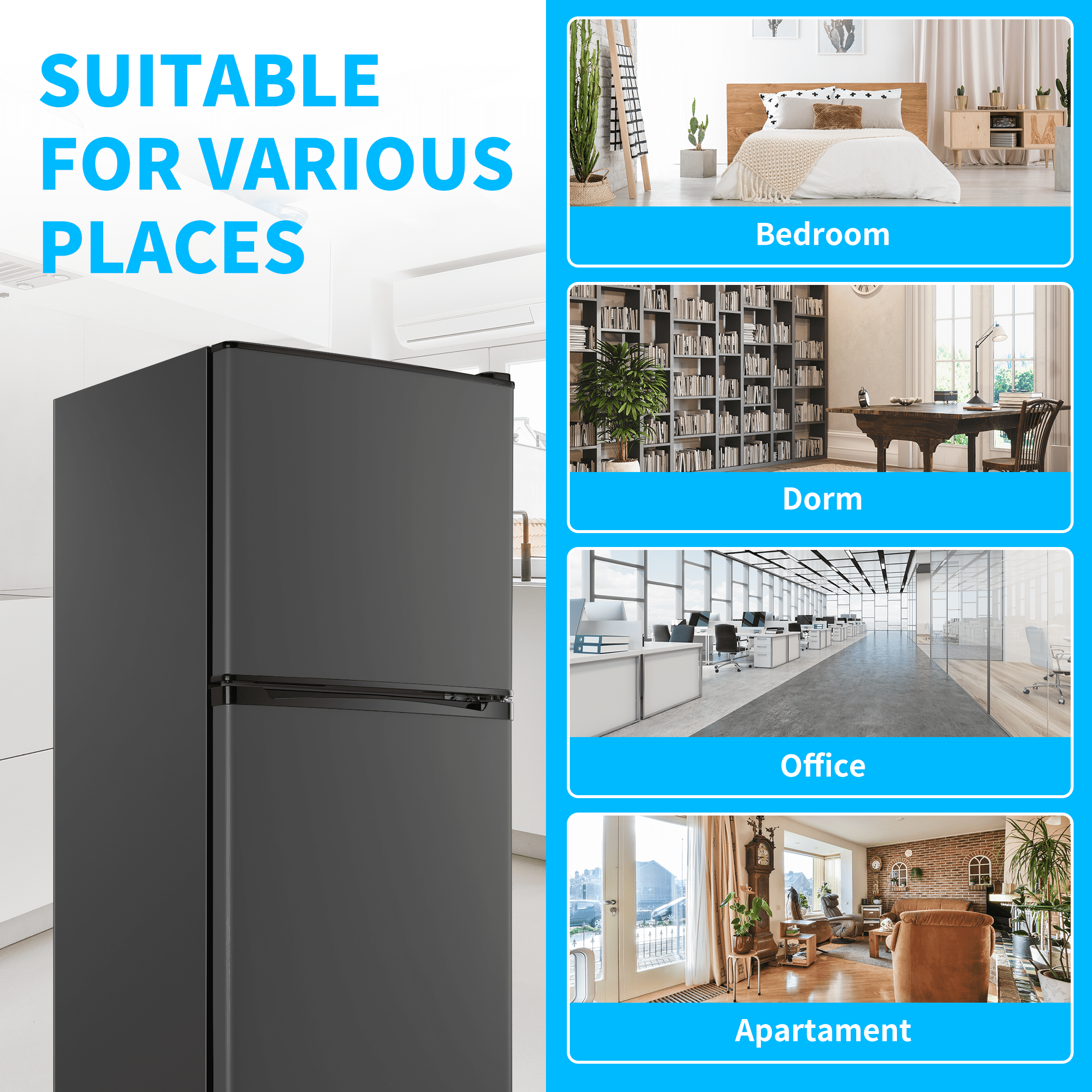 - ✔VERSATILE FEATURES & USER-FRIENDLY DESIGN: The refrigerator’s reversible door offers flexibility, making it suitable for various placements in your room and giving you the freedom to choose your preferred door-opening direction. Its adjustable feet ensure stable and horizontal placement, preventing any wetness on the floor. Ideal for diverse environments, this small refrigerator is perfect for families, dormitories, bedrooms, offices, apartments, and garages.