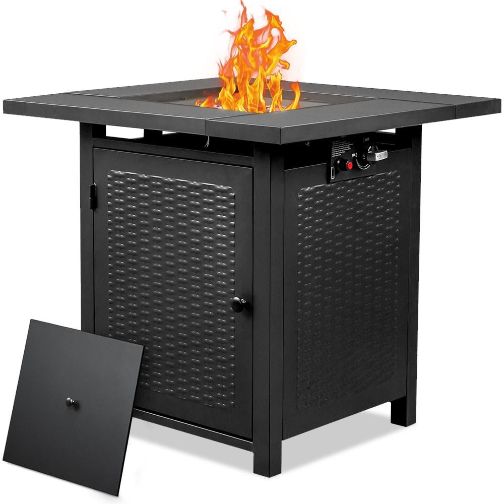 Our 28-inch square gas fire pit is a versatile piece of patio furniture that you’ll find yourself using all year round. This outdoor fire table is made of sturdy steel material for strong durability. The base features slide-out hidden storage where you can store the propane tank and comes with a lid to change as a dining table. The fire pit produces up to 40,000 BTU, you can enjoy all the pleasures of a warm fire without worrying about messy ashes. The stylish and simple appearance can perfectly match your garden, courtyard, and terrace.