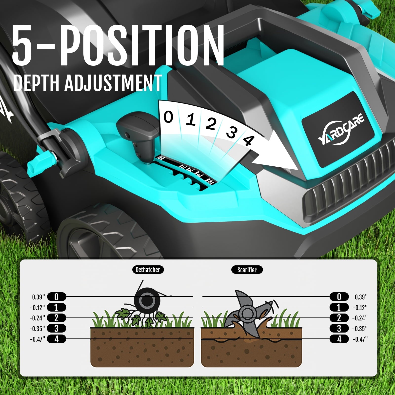 - Adjustable Depth Settings – The five-position depth adjustment dial lets you fine-tune lawn treatment based on the time of year or the level of thatch. Choose scarifying depths from -0.47″ to -0.12″ for aggressive soil revitalization, or dethatching depths from -0.24″ to 0.39″ for lighter surface clearing. Easily adaptable for early spring recovery or fall cleanup.