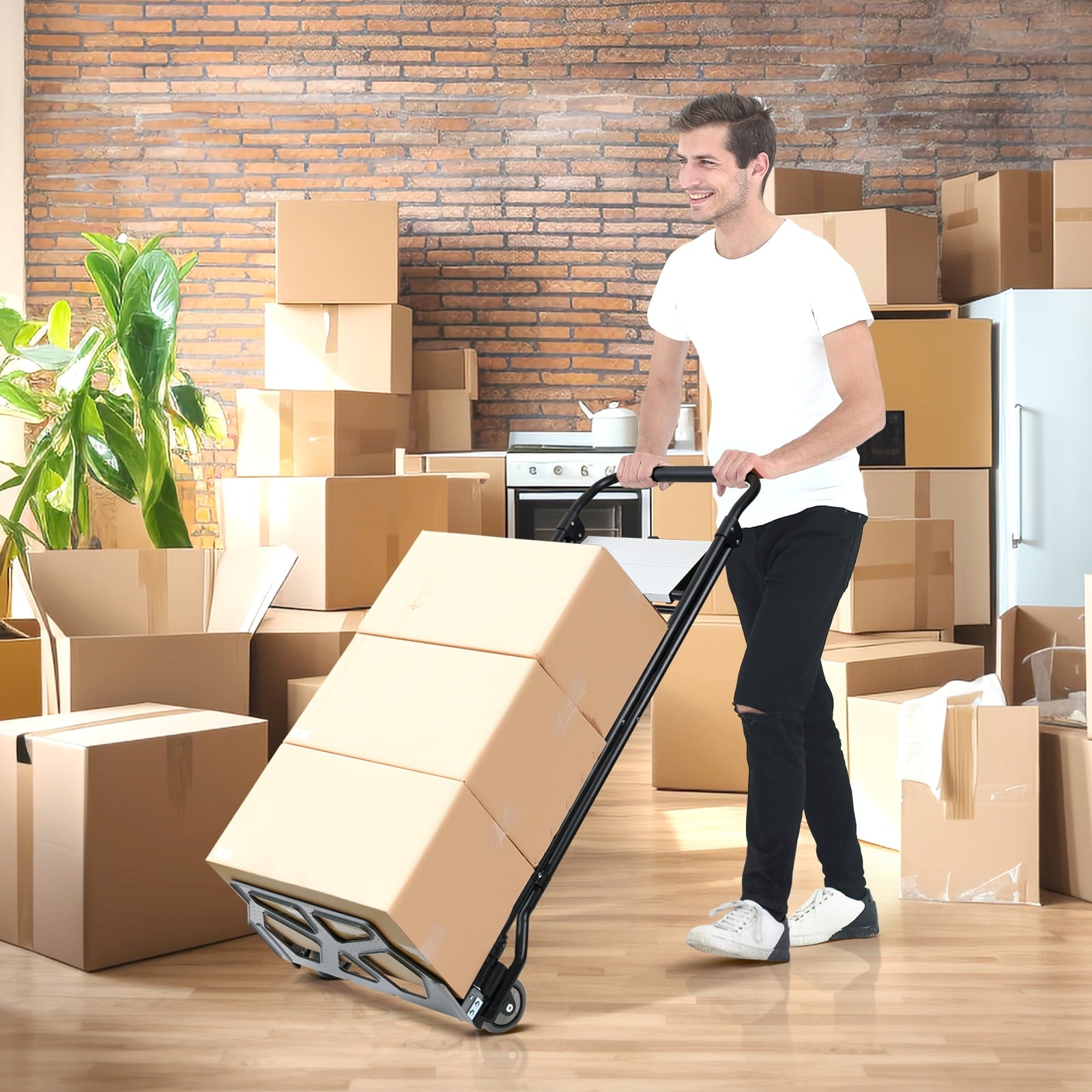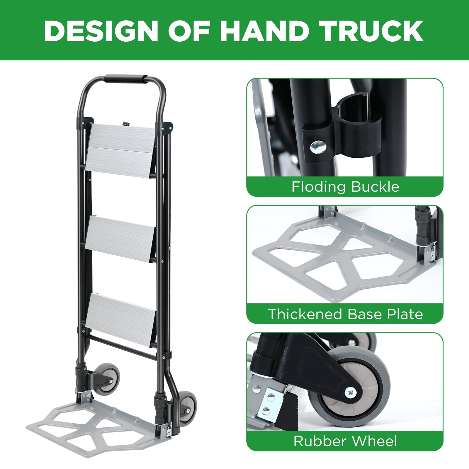 • Hand Truck Designs: You just need to step on the loading platform and the two wheels will open accordingly. The loading plate can accommodate heavy luggage, and the foldable dolly can be moved by tilting it backward. Two large rubber wheels can also help transport goods to the stairs.