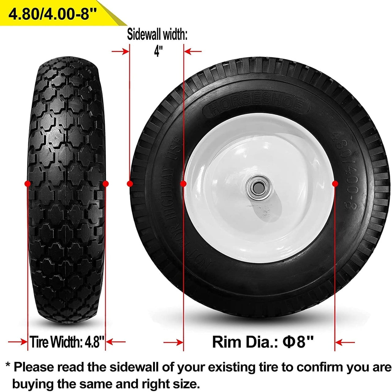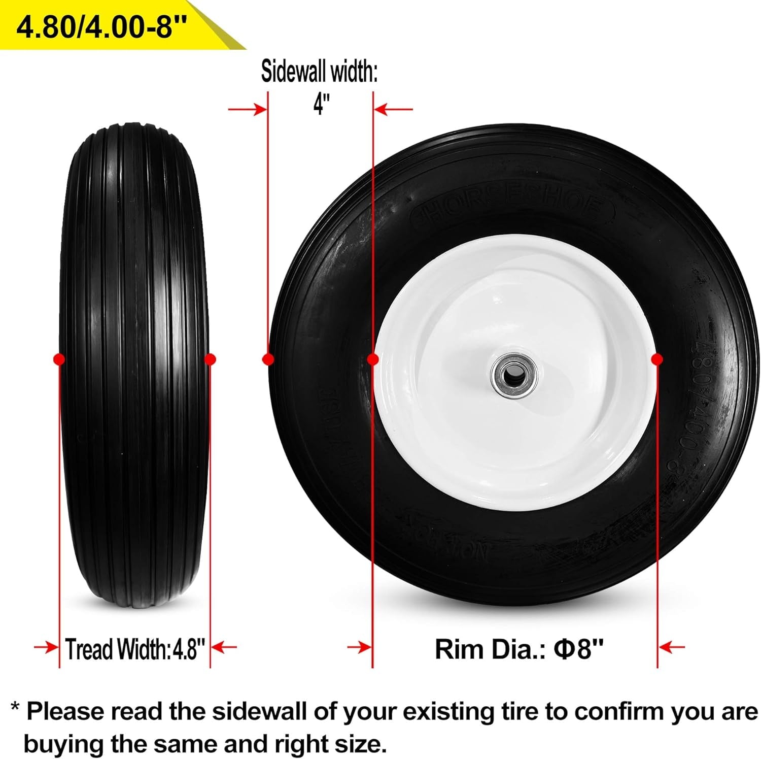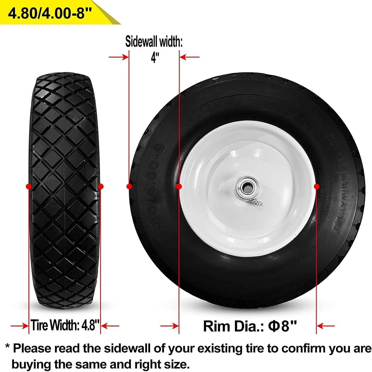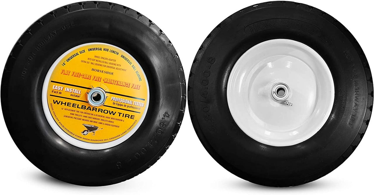 Horseshoe 2-Pack Solid Flat Free 4.80/4.00-8″ Wheel for 18 in x 3.25 Rim, Black Polyuthane Tires and Steel Wheel2 New HORSESHOE 4.80/4.00-8 Flat-Free Wheelbarrow Cart 16″ Universal Black Cross Wheels w/Grease Fitting, Center Hub 3.25″-6″, Installed 3/4″ Bearing with Extra 5/8″ Bearing 4804008 T167