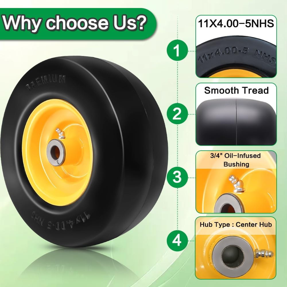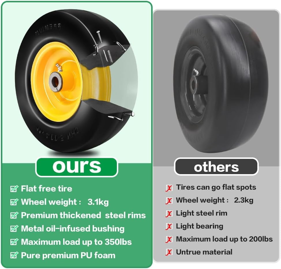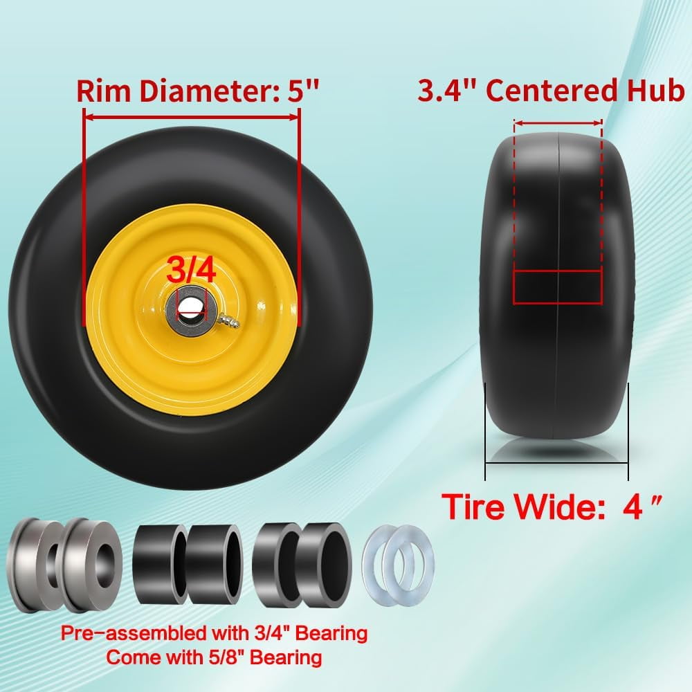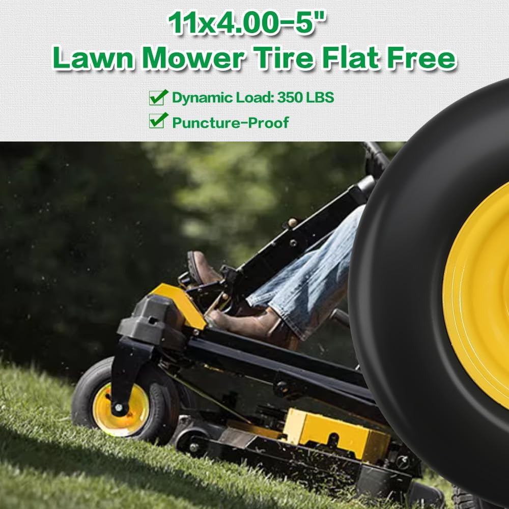 The 11×4-5 Flat Free Tire and Wheel is a premium replacement part designed for zero-turn lawn mowers. These tires are made of high-quality polyurethane foam, eliminating the need for inflation and providing a smooth, consistent ride without the risk of punctures. The seamless tread ensures minimal lawn damage while offering a feel similar to pneumatic tires. Each tire is pre-assembled with a 3.4″ centered hub and 3/4″ bushing, and an extra adapter kit includes four 5/8″ bore bushings, four nylon spacers, and four steel spacers for easy customization. Ideal for use in yards and gardens, these tires are built for durability and long-lasting performance.