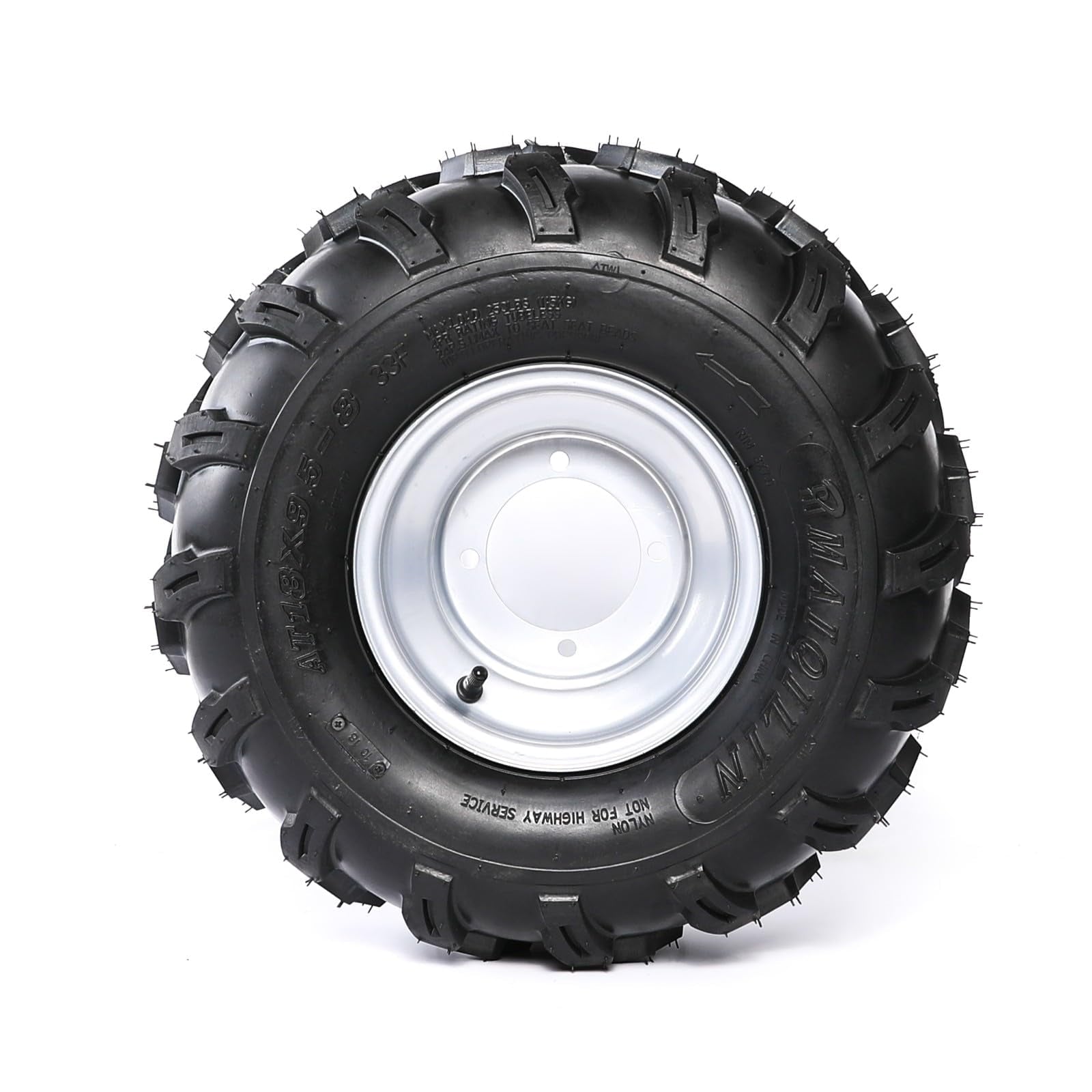 18×9.50-8 Wheel Tyre Rim ATV Quad/Buggy/Ride on Mower Gokart Tire 8″ inch rear 4 PLY Rating 10 P.S.I Operation Pressure (165 Kpa) 24 P.S.I Max to Seat Beads Max Load 227 LBS( 115 kg) Tread 4 Nylon Sidewall 2 Nylon Rim 6.5 AT Nylon Tubeless Splay Pattern Not for highway service 4 Stud, 110mm bolt spacing