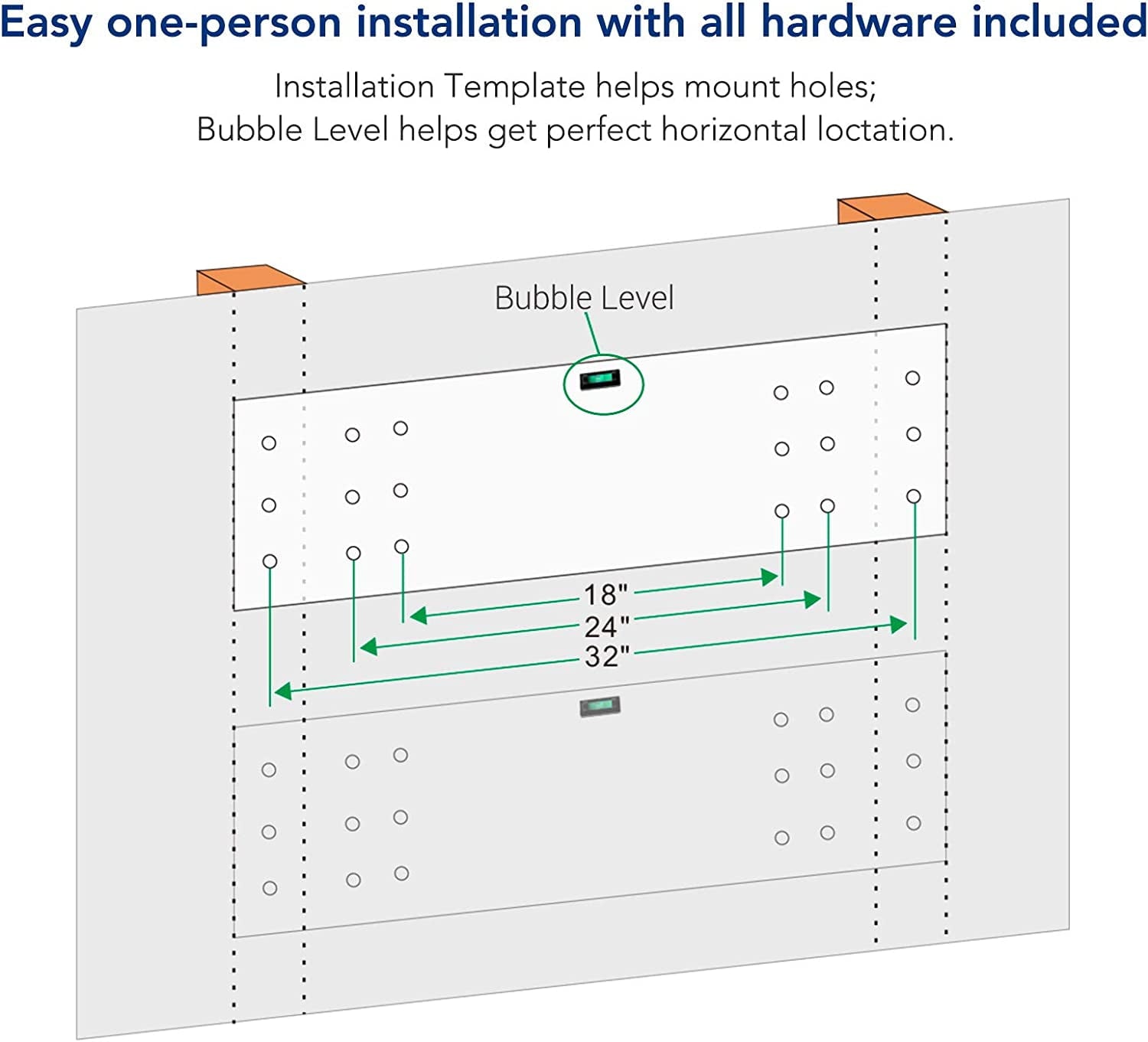 • Suitable for wood stud spacing of 18″, 24″ or 32″. Can NOT be mounted to metal wall.