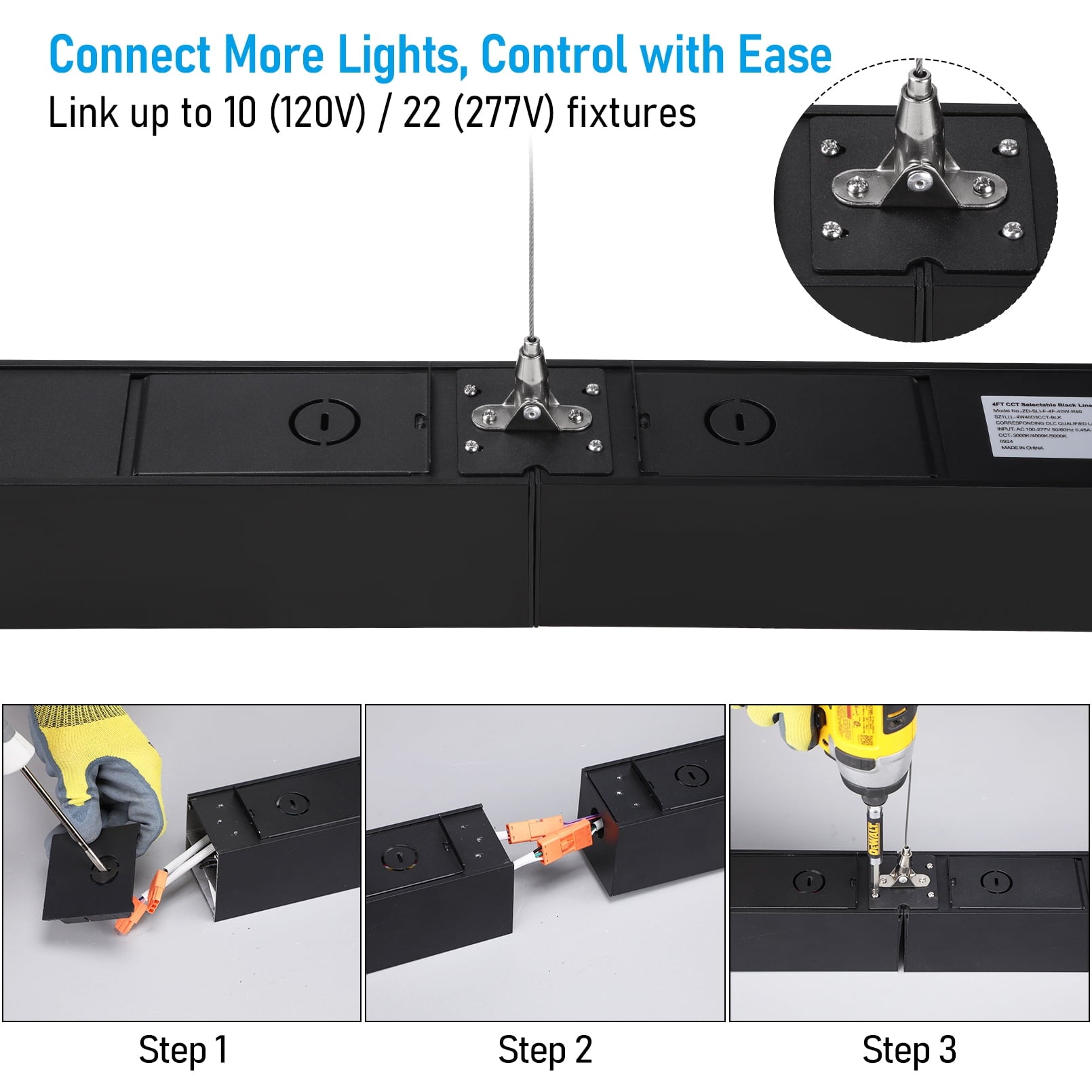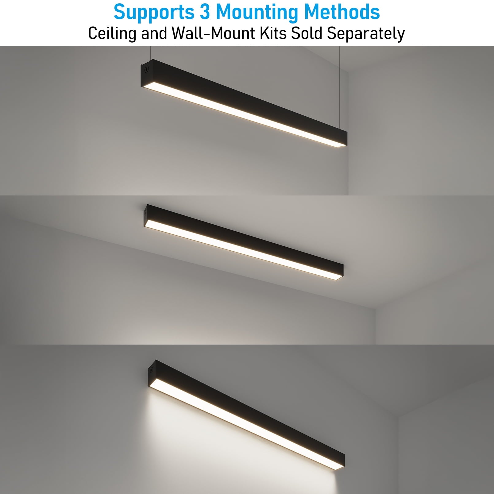 Use it as a single fixture or link multiple units into a continuous run—up to 10 units at 120V or 22 units at 270V—with just one switch to control the entire series. Every light comes with hanging hardware, and you can add professional ceiling- or wall-mount kits (sold separately) for even more installation flexibility.