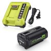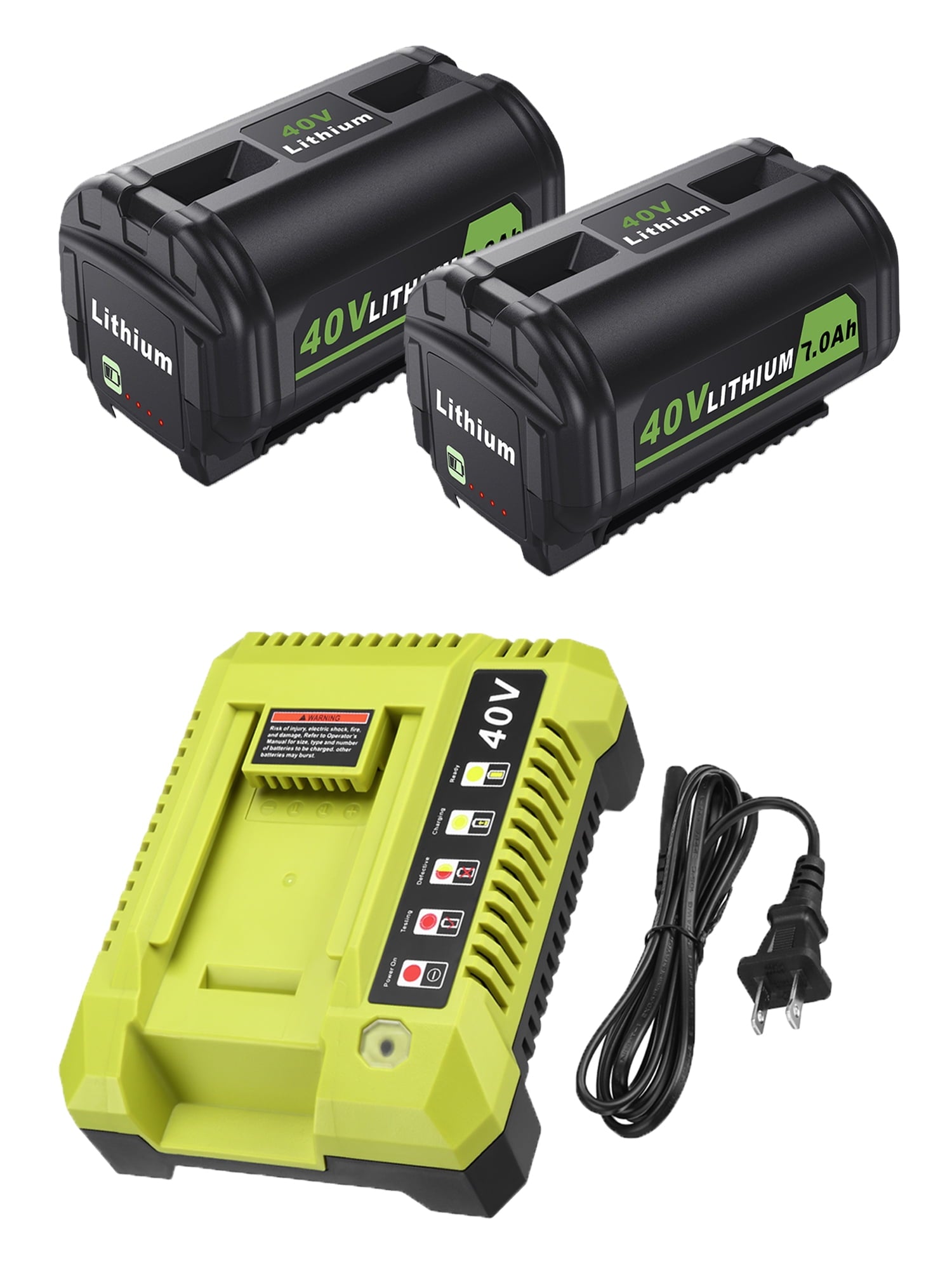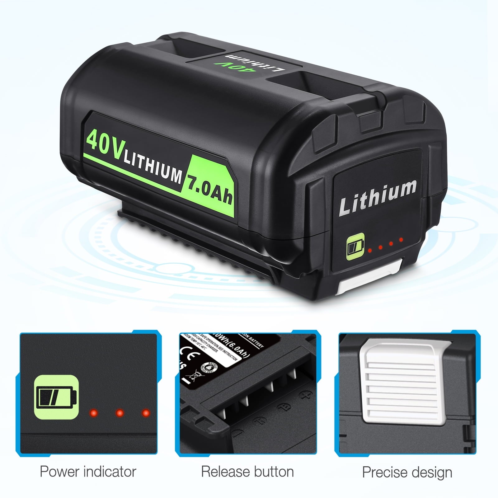 * Battery Feature : Replacement OEM# OP4060A: Battery Type: Lithium-ion | Voltage: 40V | Capacity: 7000mAh | Removable & Rechargeable | High capacity battery for extended run time;* Compatible With : This battery works with all RYOBI 40-Volt lithium-ion tools (string trimmer, lawn mower) and chargers, including RY40200 RY40403 RY40204 RY40530 RY40460 RY40180 RY40250, and OP403A OP401 ZROP401 OP400A RY40440;* Replace Model : for Ryobi 40V battery part#: OP4050A OP4015 OP4026 OP40201 OP40261 OP4030 OP40301 OP4040 OP40401 OP4050 OP40501 OP40601;* LED Indicator : On-board Battery Life Indicator: 4 LED lights on the battery that indicate the remaining power for user convenience and over-molded edges for impact protection;* Safe & Reliable : The lithium-ion battery is CE, FCC, ROHS certified, built-in over-charge, over-discharge, over-voltage, over-current, and over-heating protections, safety for the battery and your RYOBI 40-Volt collection. -