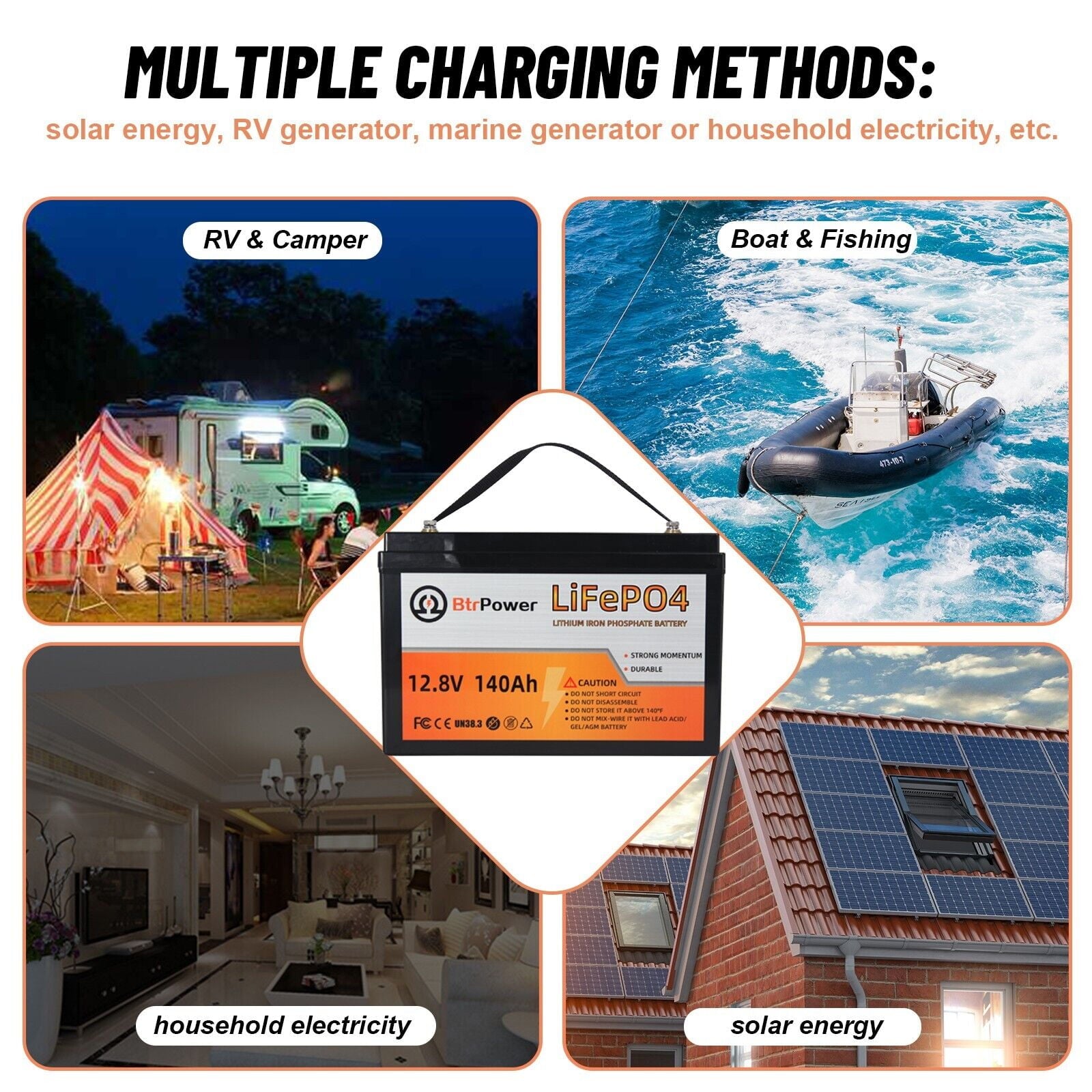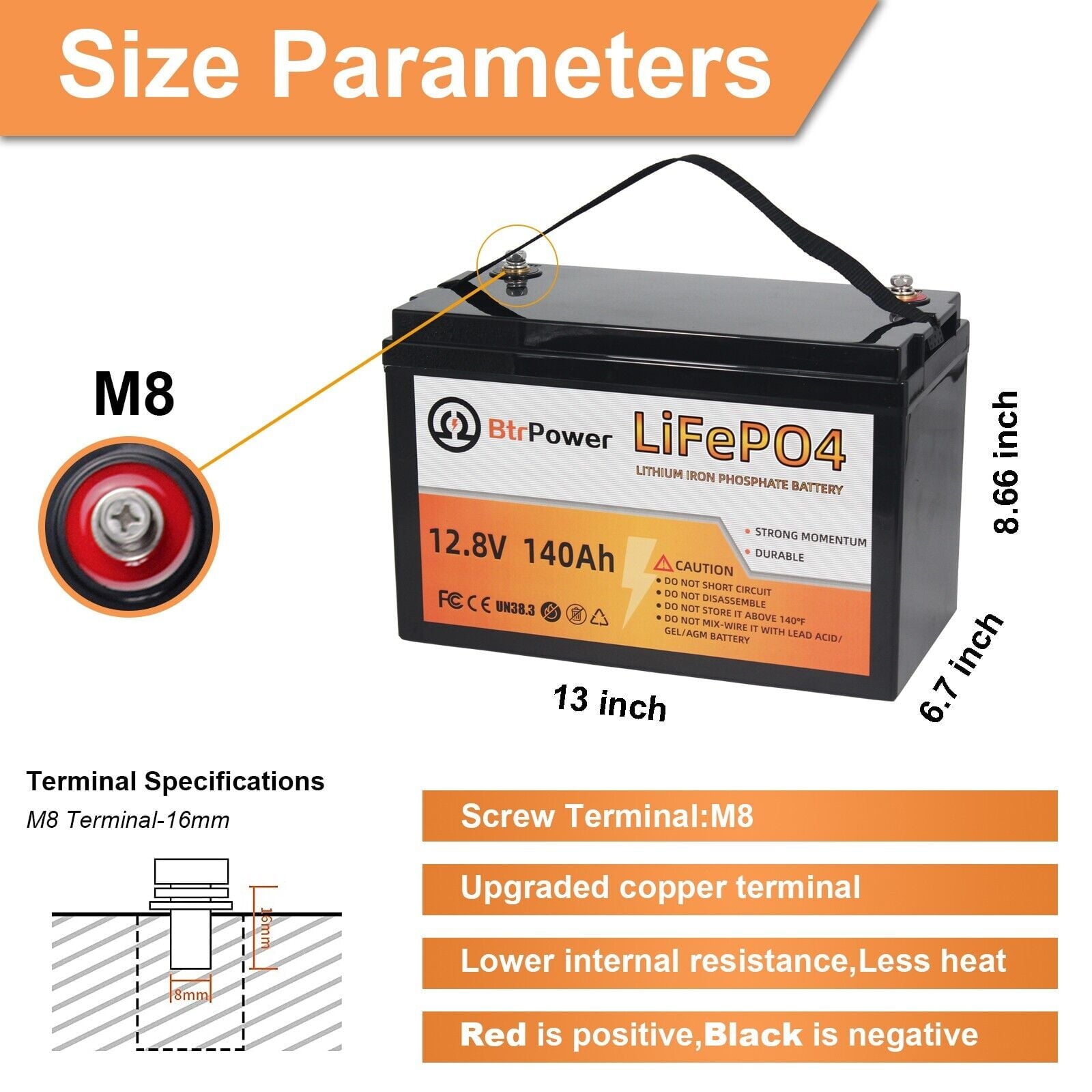 【Easy to Connect】Lithium battery 12v 140ah can be connected in series and parallel for higher voltage and larger capacity. You can connect them as 24v, 36v, 48v or up to 400ah capacity and can be widely used in RVs, trolling boats, boats, off grid systems, solar systems and are the best choice for 12V deep cycle applications in residential backup power.