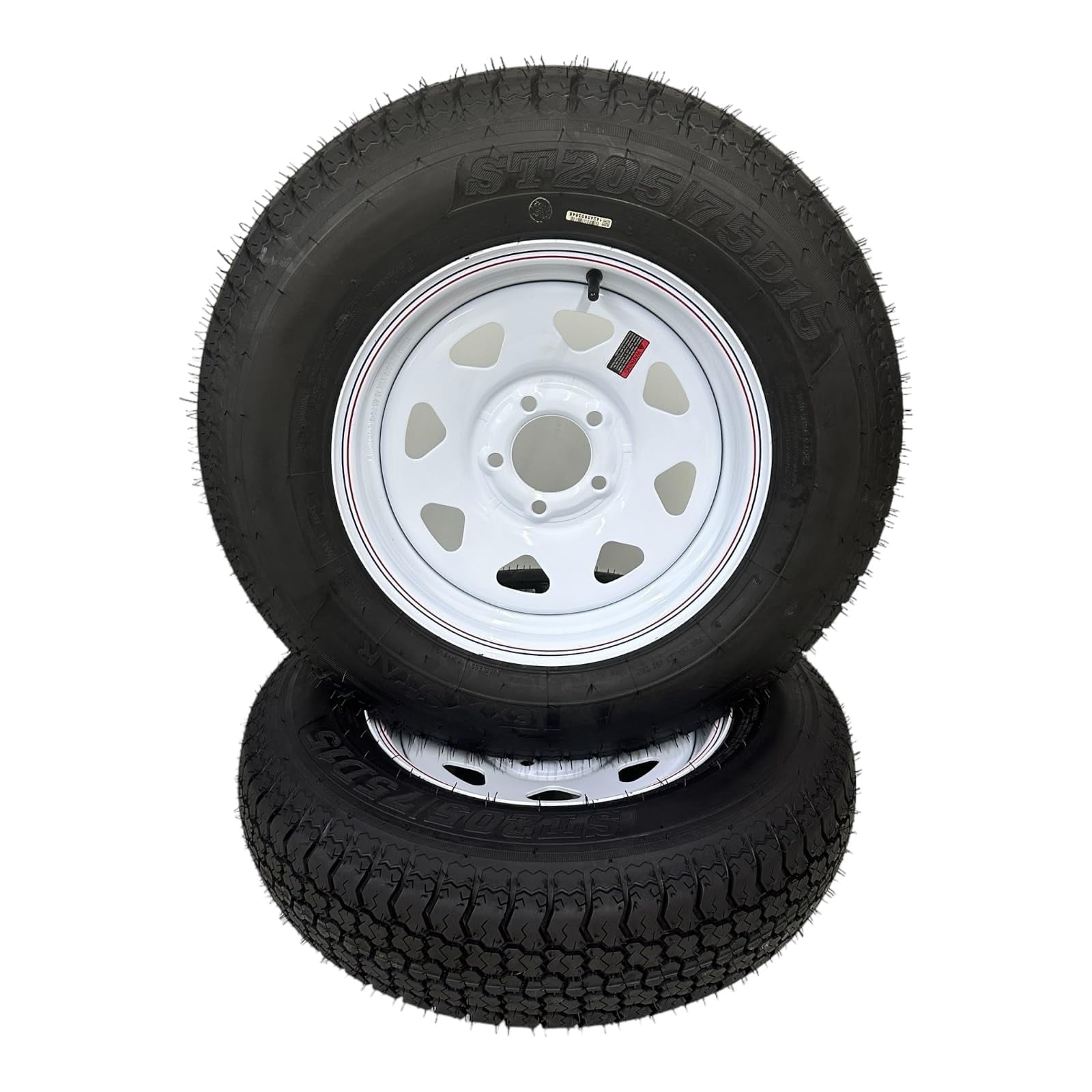 Pre-Mounted ST205/75D15 Bias Trailer Tire on Rim – 15″ White Spoke Style Wheel with a 5 Lug on 4.5″ Center Bolt Pattern. Tire is Load Range C, 6 Ply Bias, with Max Load of 1820 pounds and Max Pressure of 50 PSI. Aspect Ratio 75, Section Width 205, and Rim Diameter 15 Inches. Speeding Rating M with Load Index 101. Tread Depth 7.8/32nds. Center Bore 3.19″ and Offset “0” with Hub Stud Nut Requirement of 1/2-20 60 Degree Cone Nut. (note: some tires will have slight dip/indent on sidewall, called a splice, it occurs in manufacturing, this is not a defect in any way). Warranty Included Pack Quantity: 2 Assemblies