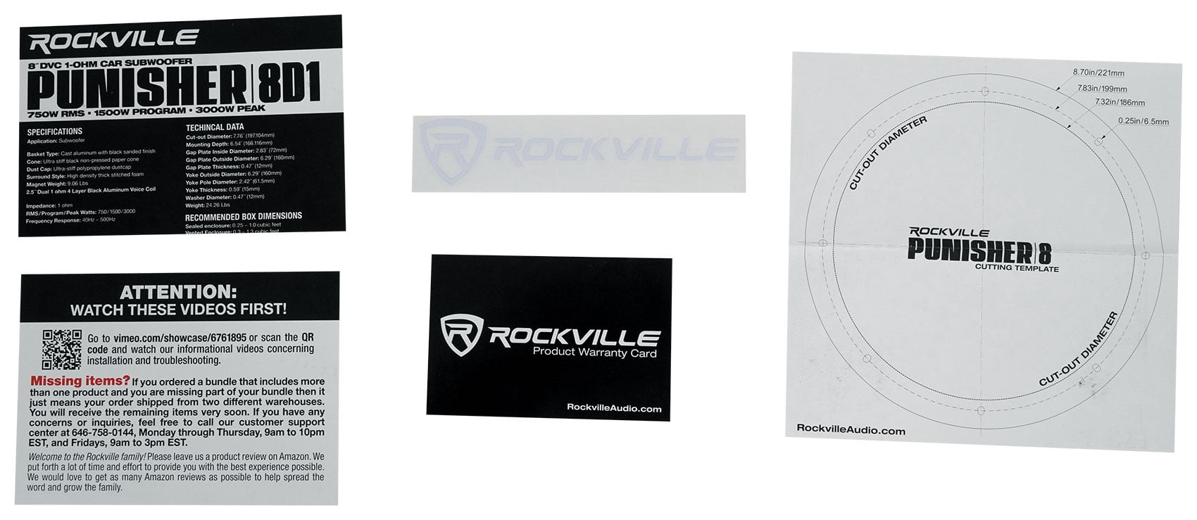- Features: Rockville PUNISHER Series 8″ Dual 1-Ohm Car Subwoofer. Peak Power Handling: 3000 Watts. Program Power Handling: 1500 Watts. RMS Power Handling: 750 Watts. 2.5″ 4-Layer Black Aluminum Voice Coils Wound with OFC Wire. This voice coil is stable up to 250 degrees celcius! The voice coil windings are made in the USA. Double Stacked 145 Oz Y35 Magnet. Cast Aluminum Basket With Black Sanded Finish.